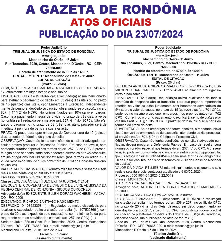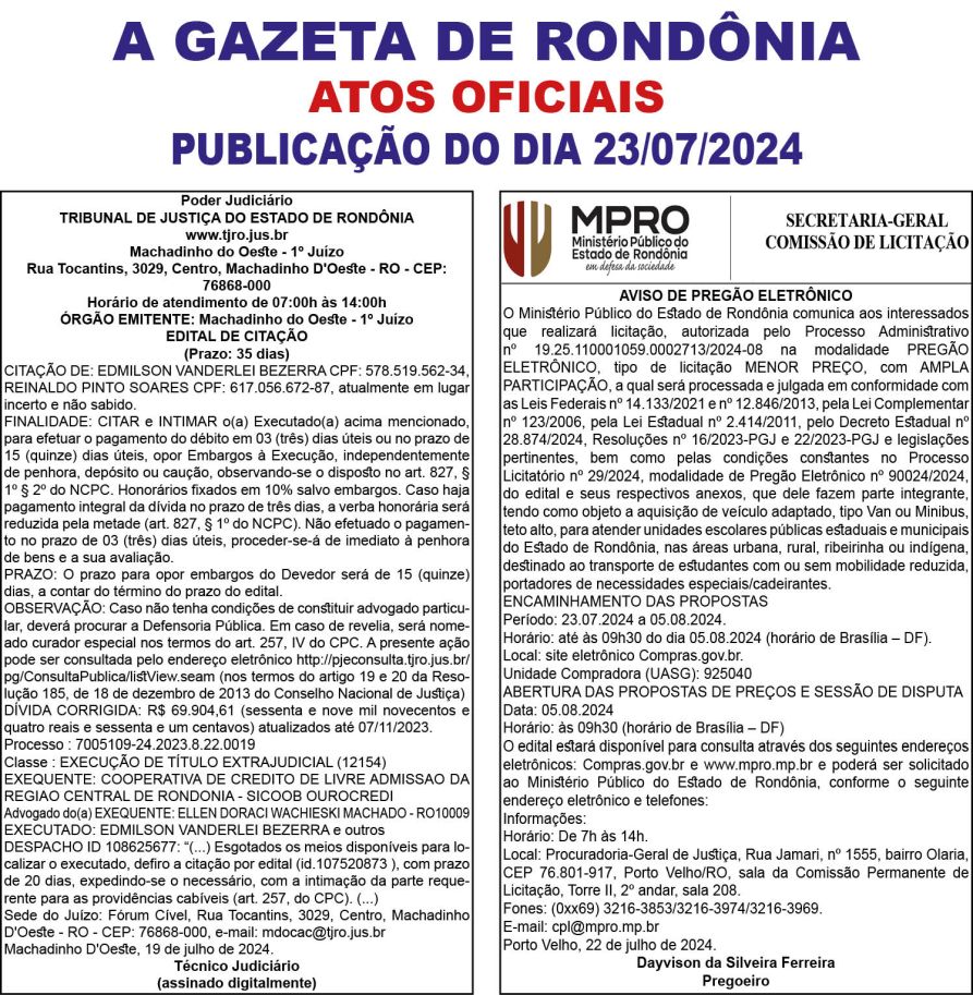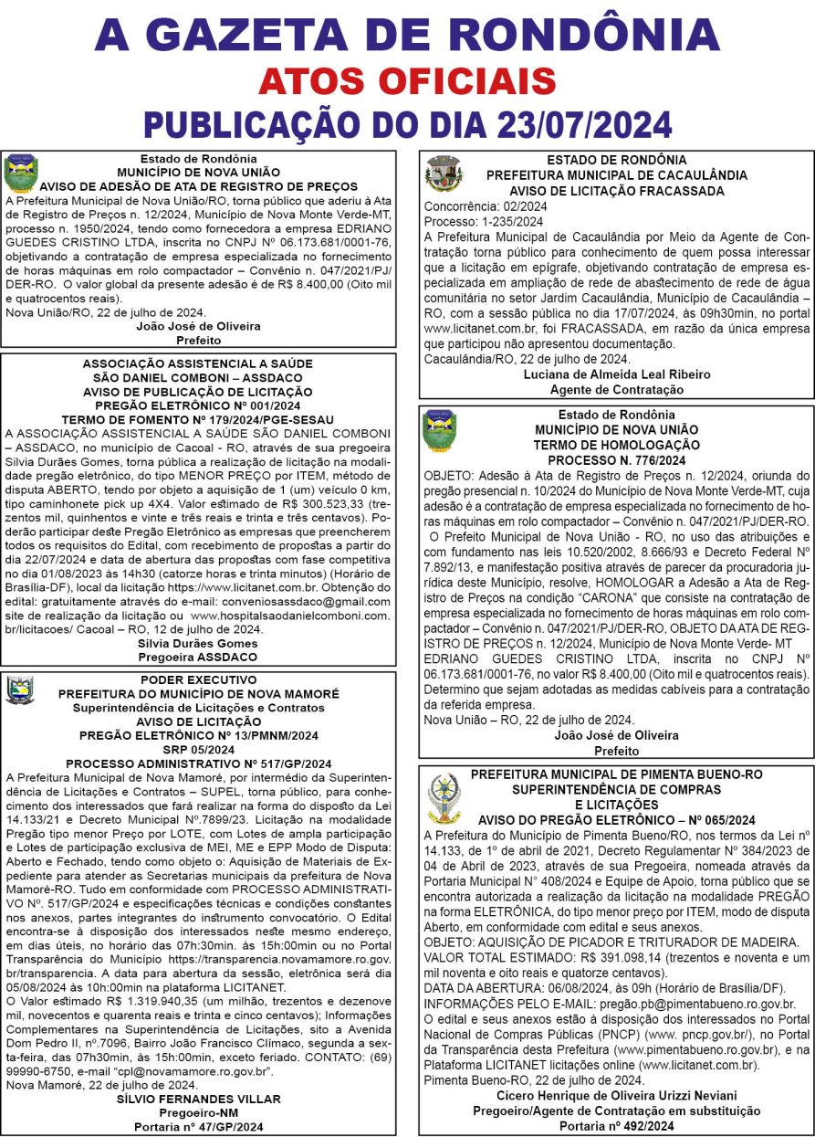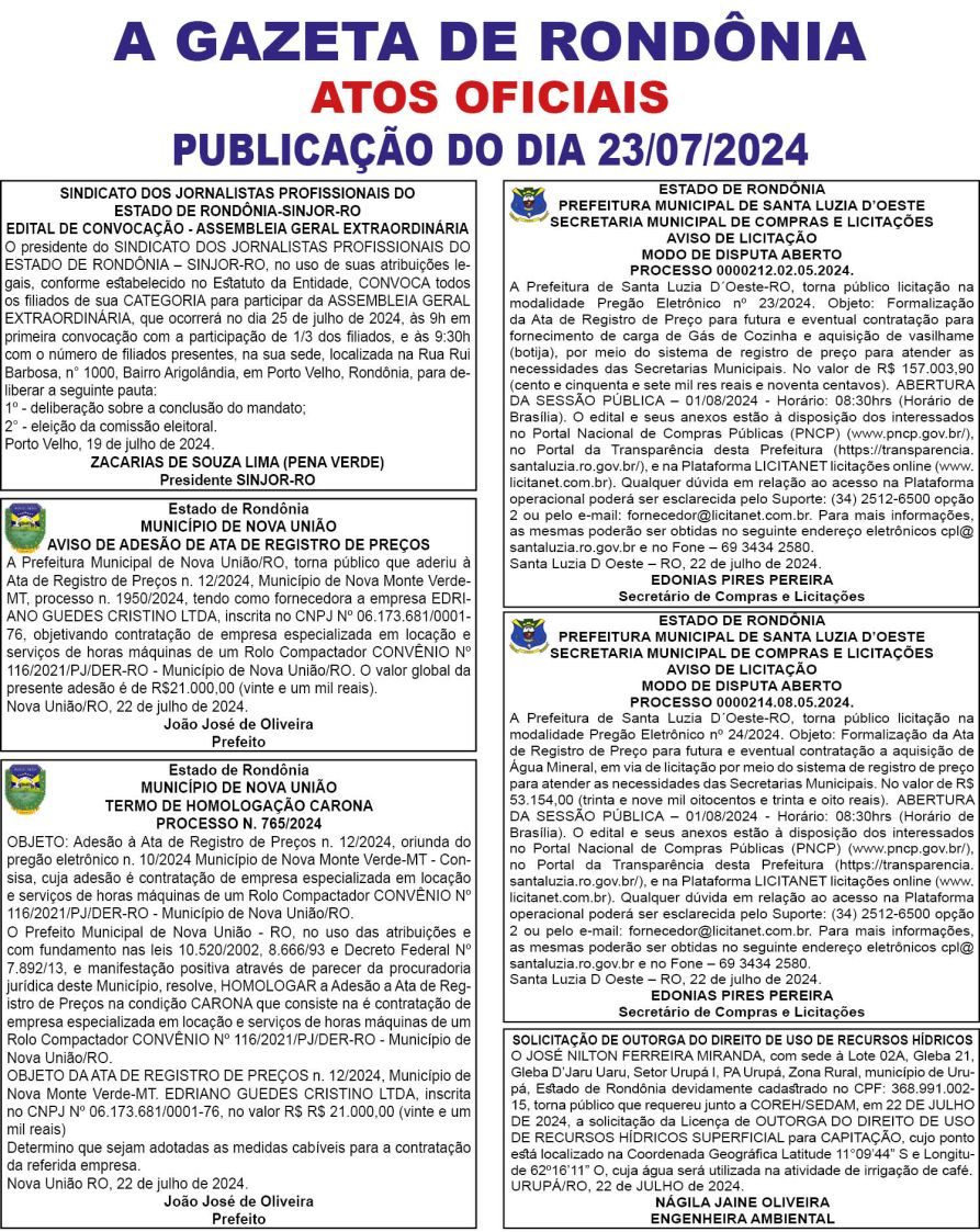 A GAZETA DE RONDÔNIA ATOS OFICIAIS PUBLICAÇÃO DO DIA 23/07/2024
