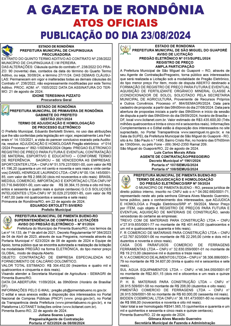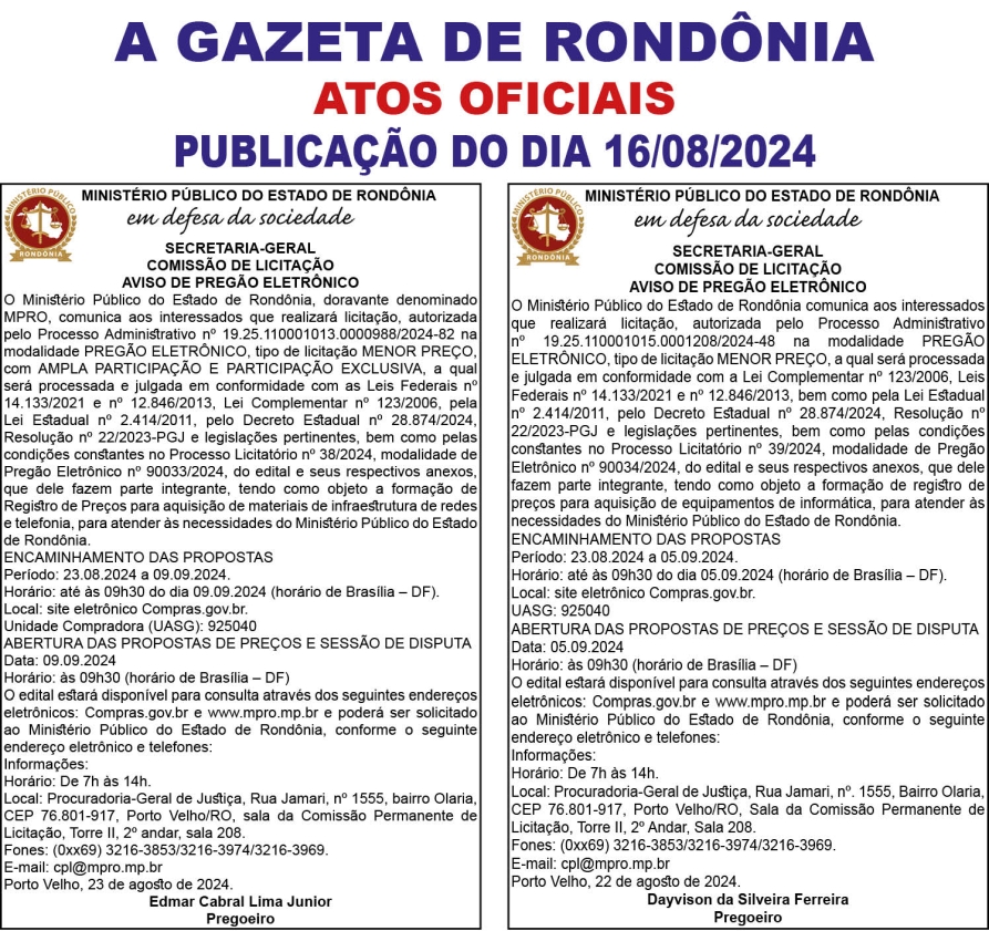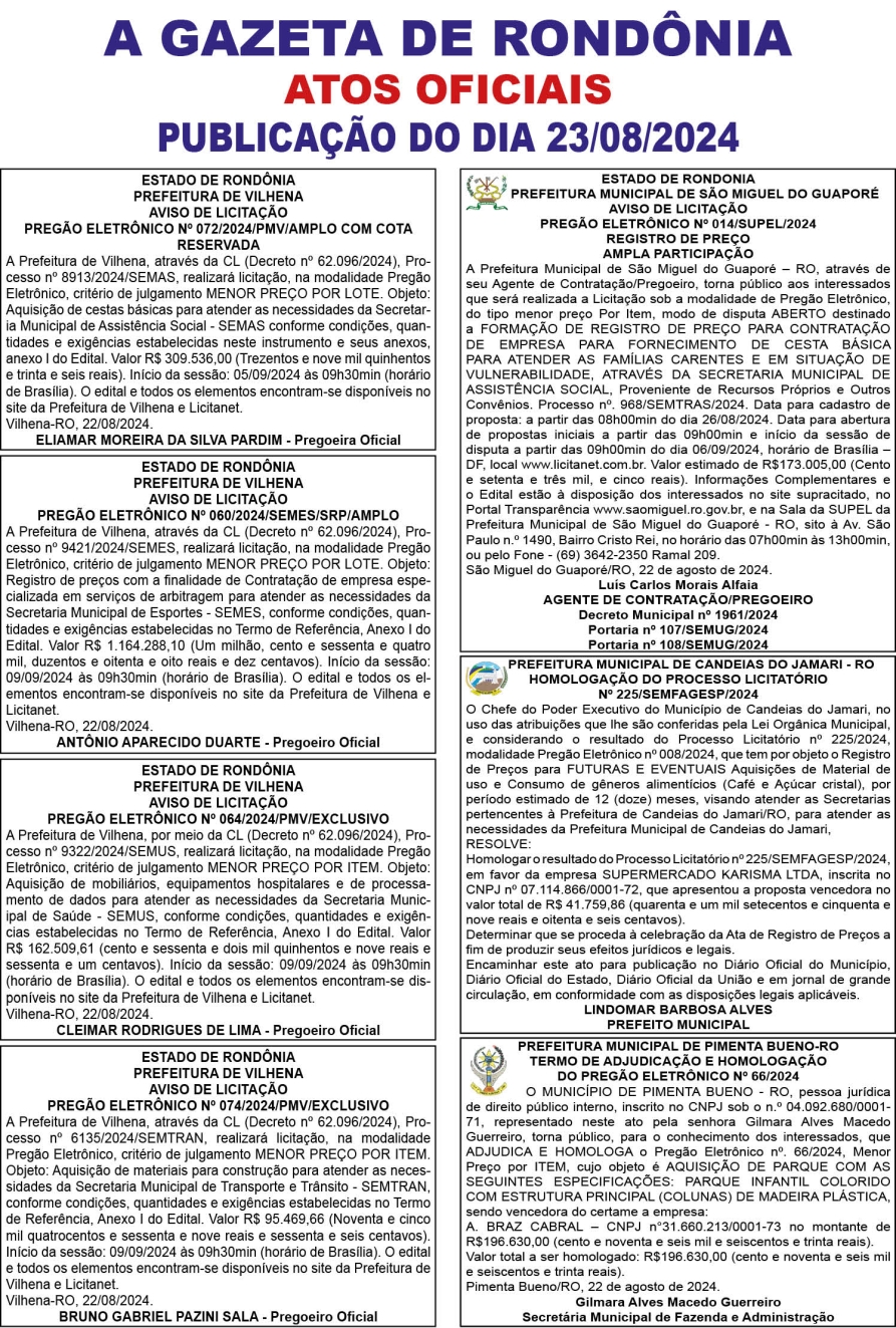 A GAZETA DE RONDÔNIA ATOS OFICIAIS PUBLICAÇÃO DO DIA 23/08/2024