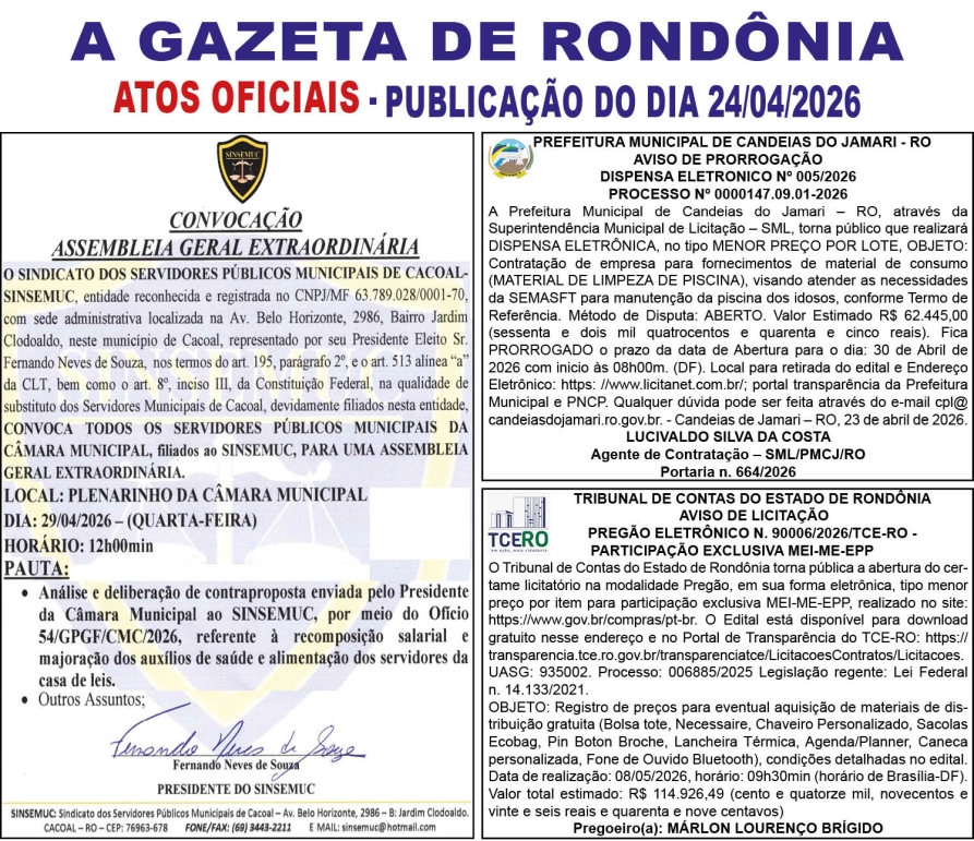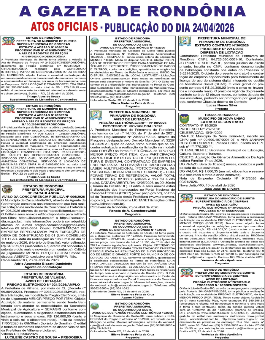 A GAZETA DE RONDÔNIA ATOS OFICIAIS PUBLICAÇÃO DO DIA 24/04/2026