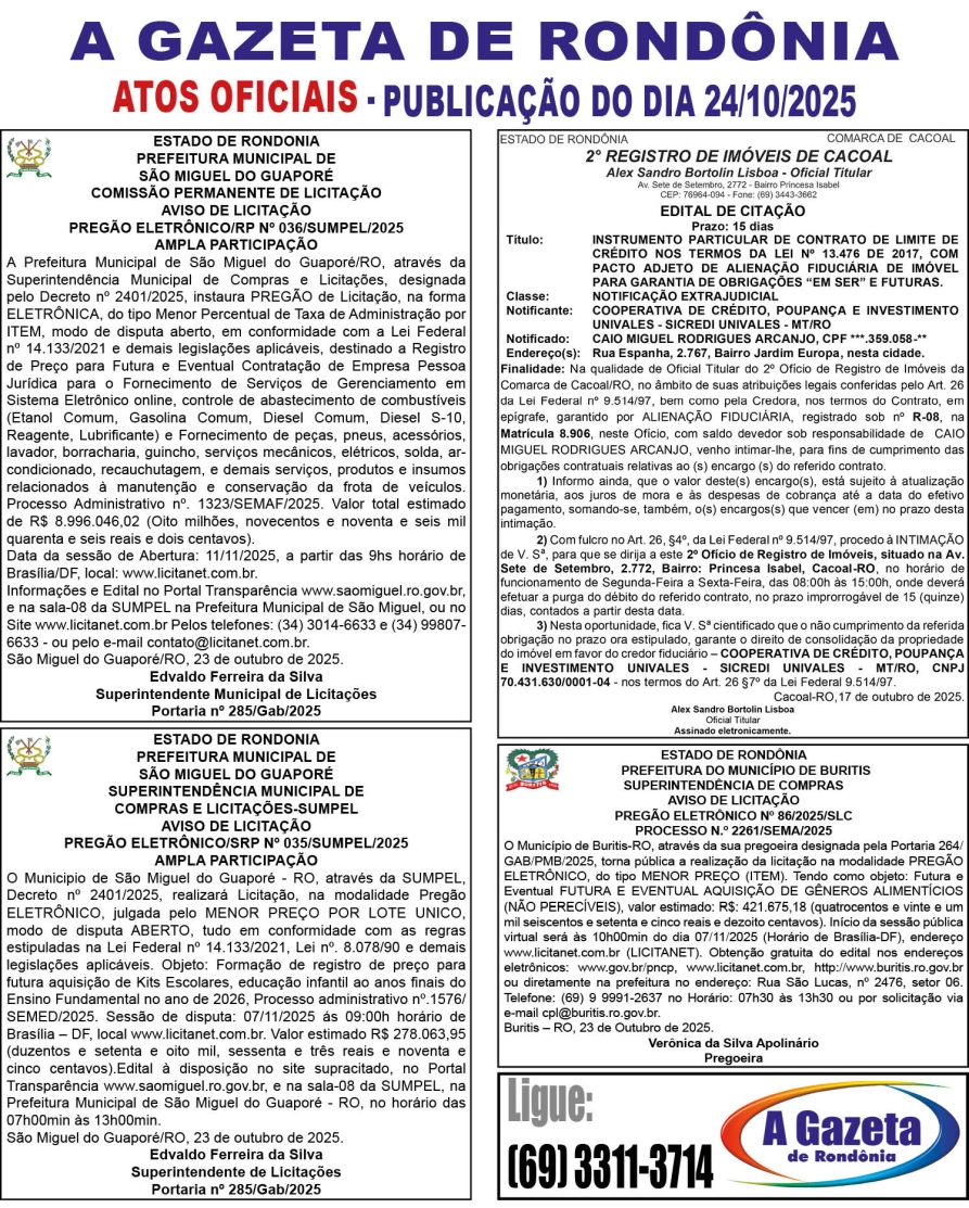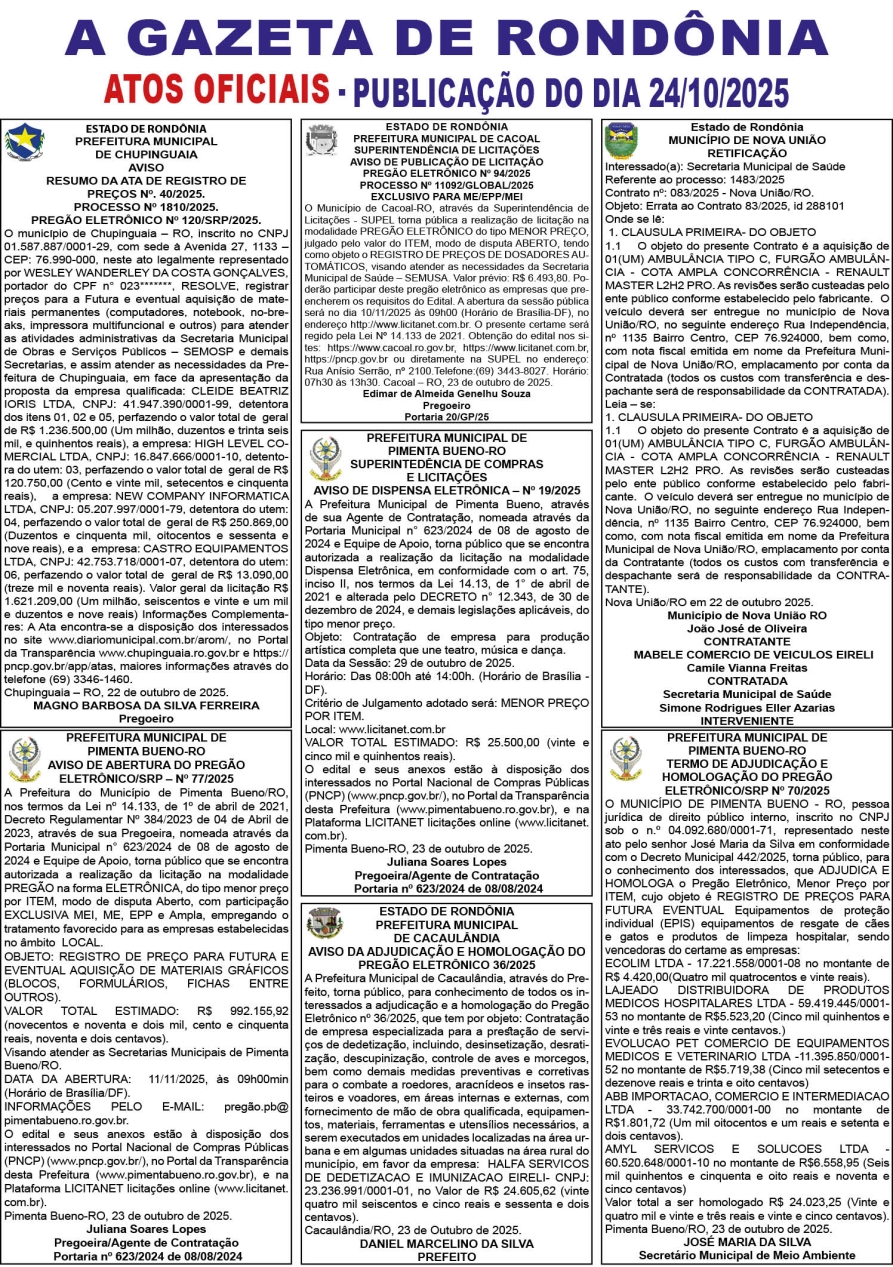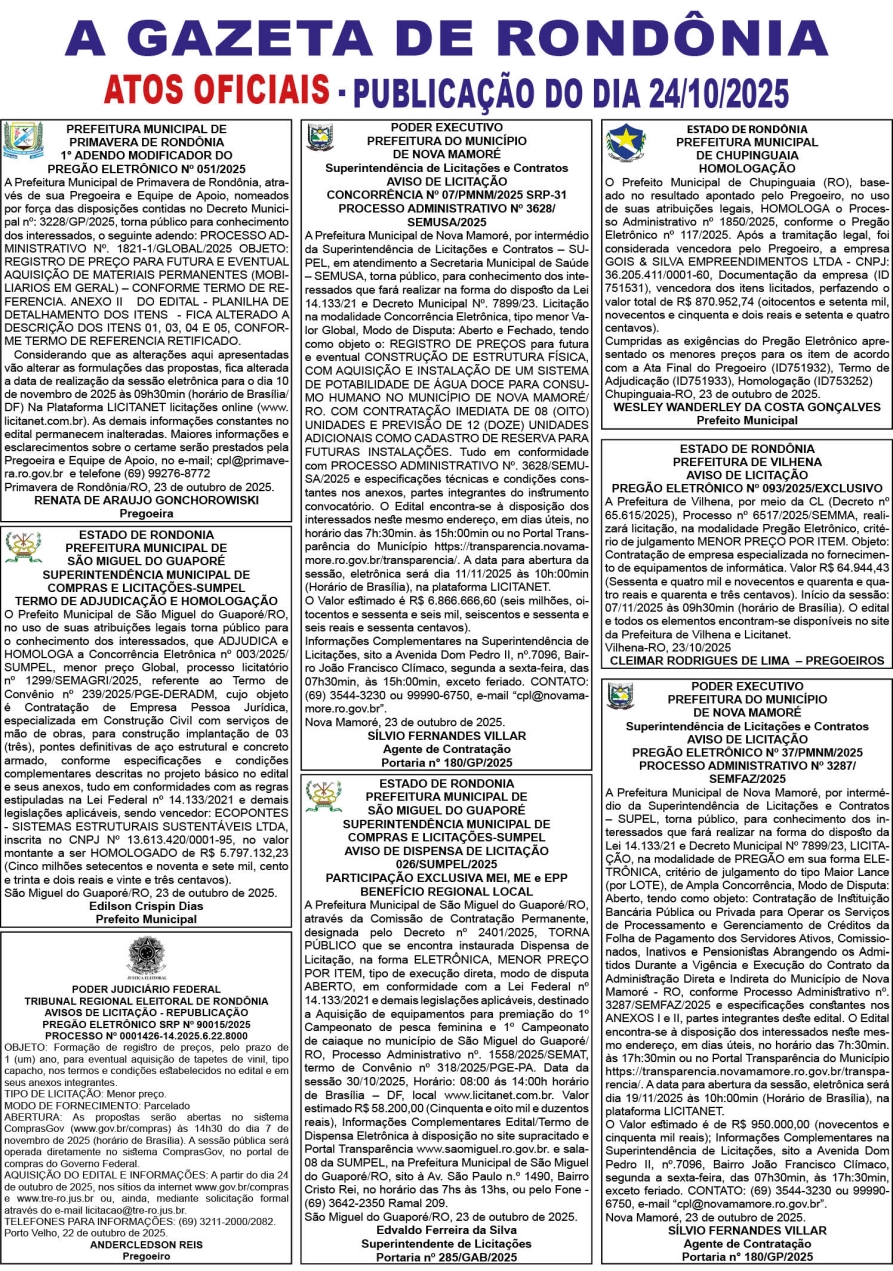 A GAZETA DE RONDÔNIA ATOS OFICIAIS PUBLICAÇÃO DO DIA 24/10/2025