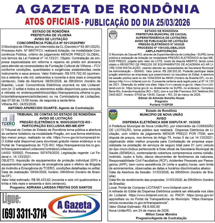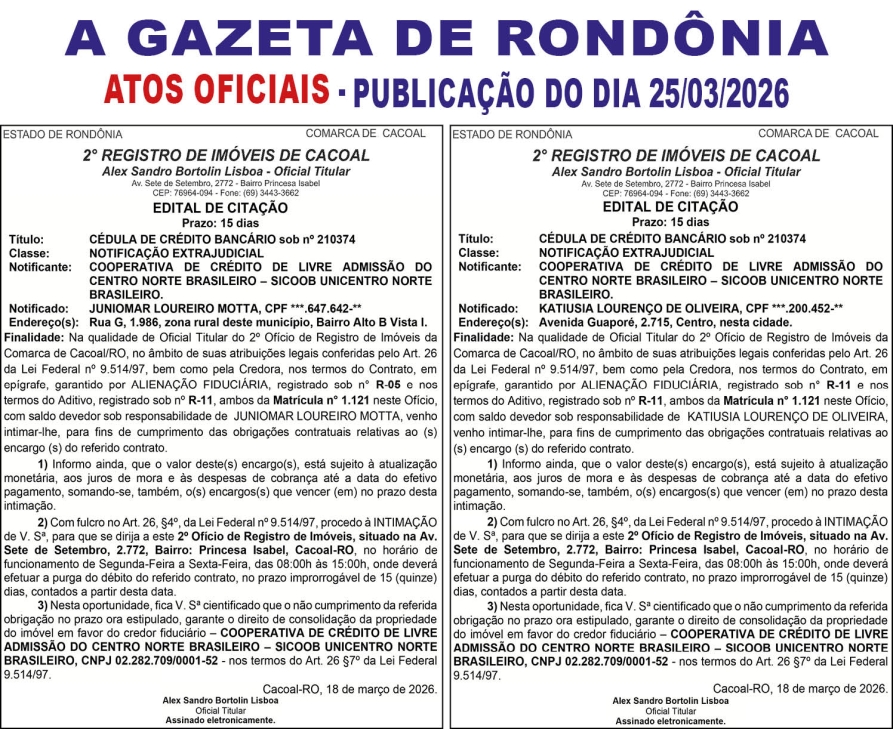 A GAZETA DE RONDÔNIA ATOS OFICIAIS PUBLICAÇÃO DO DIA 25/03/2026