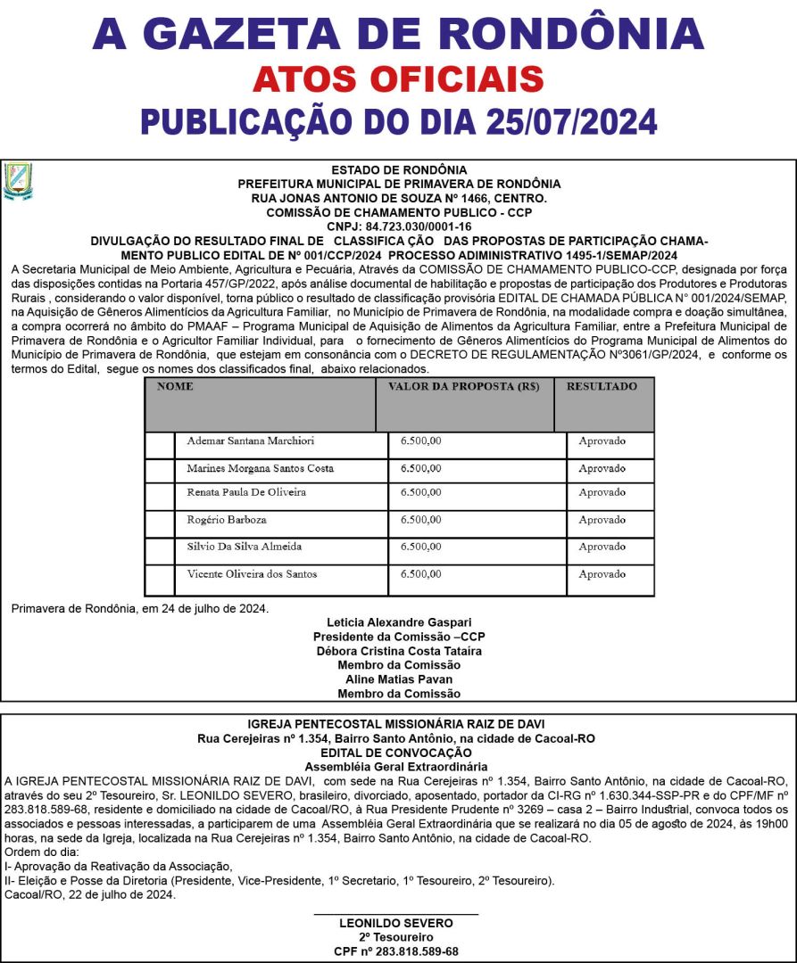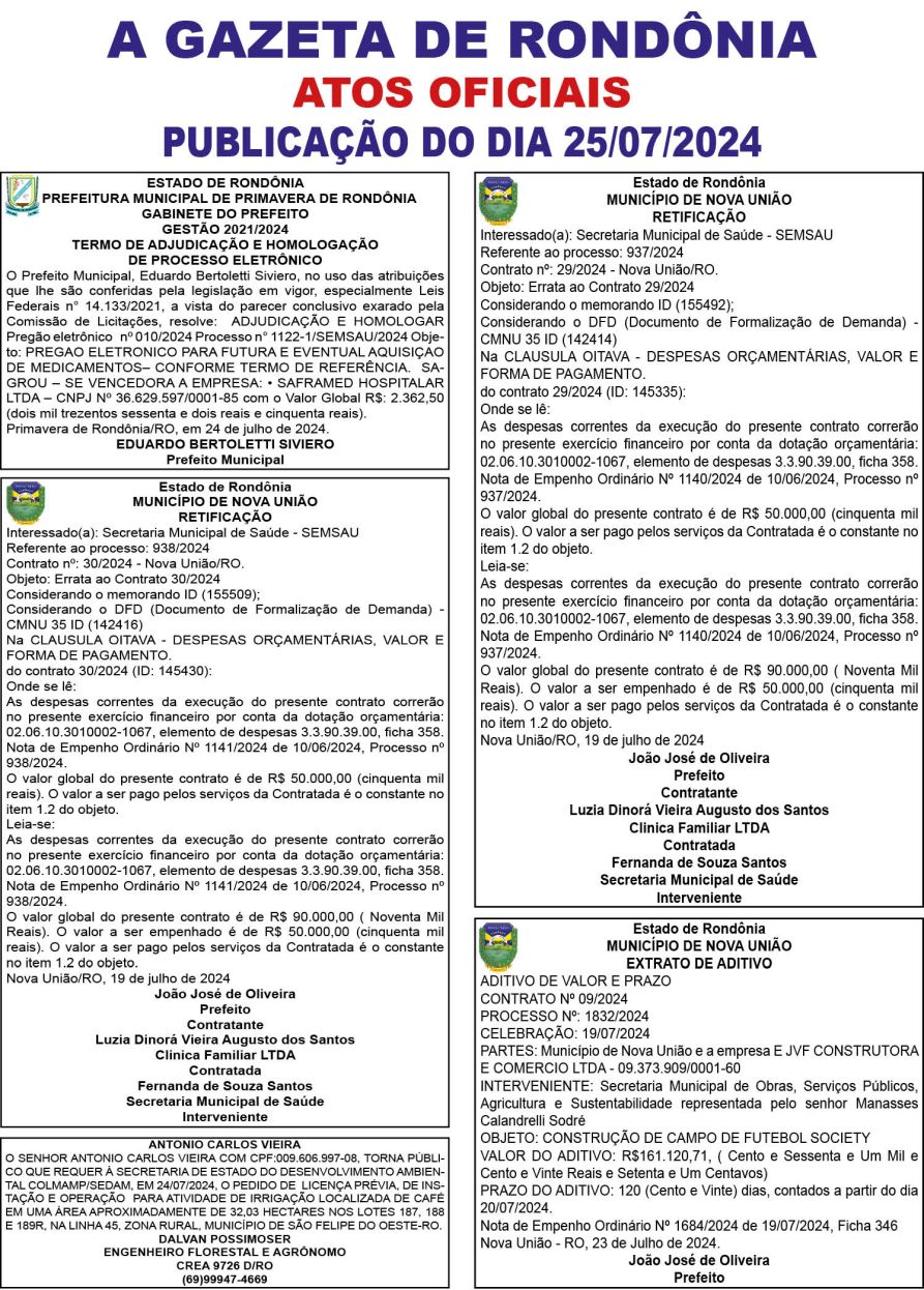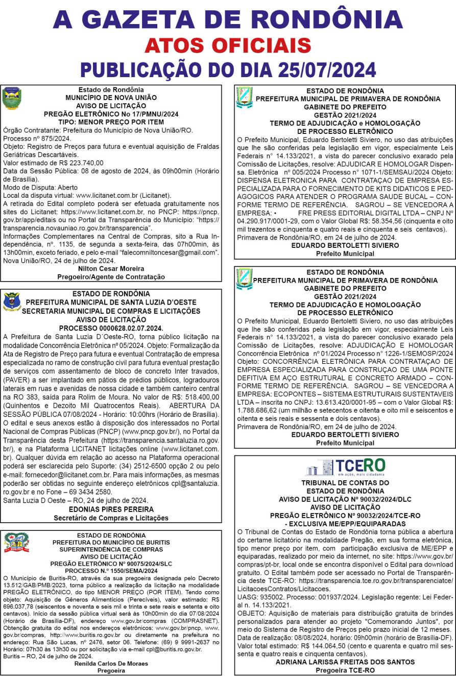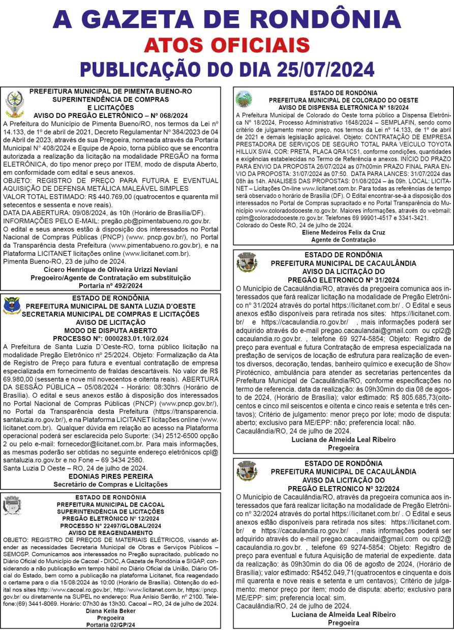 A GAZETA DE RONDÔNIA ATOS OFICIAIS PUBLICAÇÃO DO DIA 25/07/2024