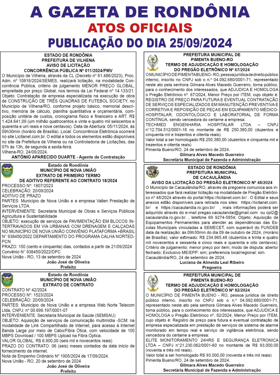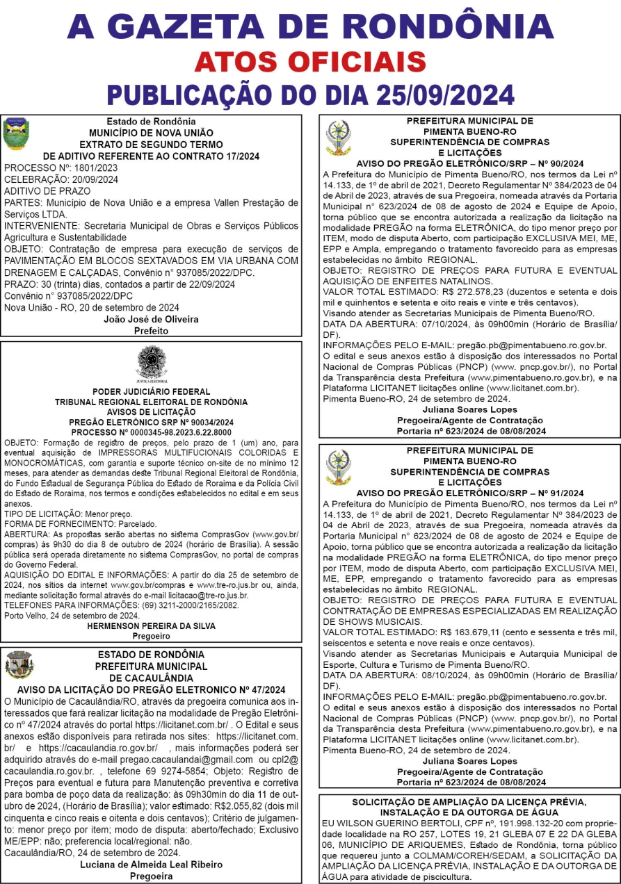 A GAZETA DE RONDÔNIA ATOS OFICIAIS PUBLICAÇÃO DO DIA 25/09/2024