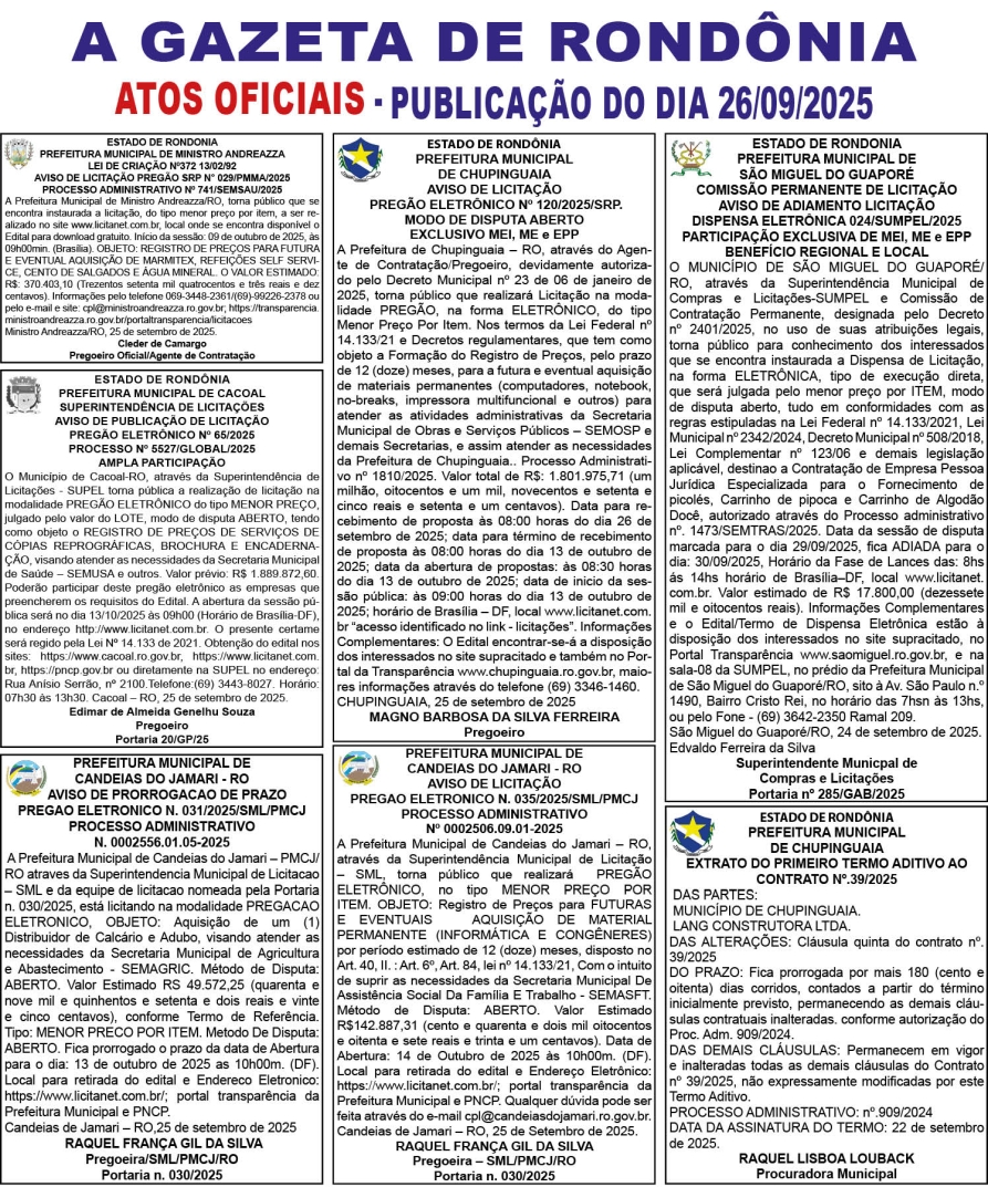 A GAZETA DE RONDÔNIA ATOS OFICIAIS PUBLICAÇÃO DO DIA 26/09/2025