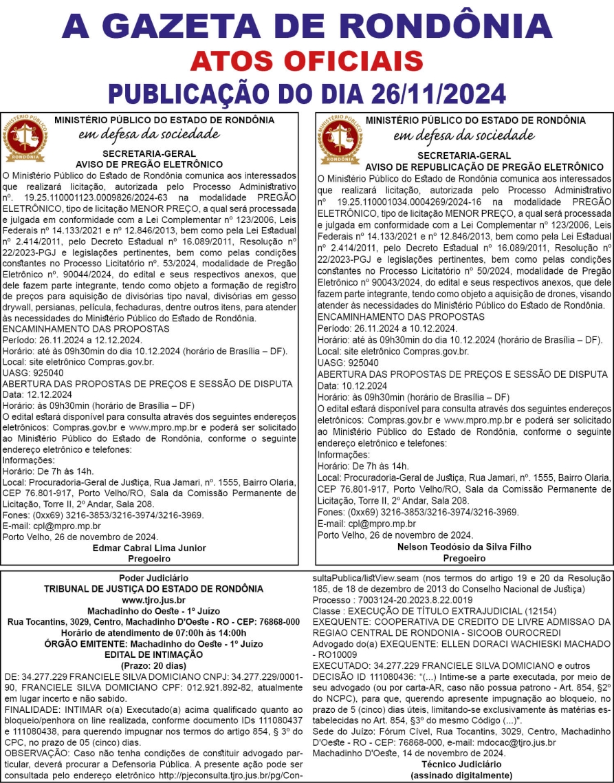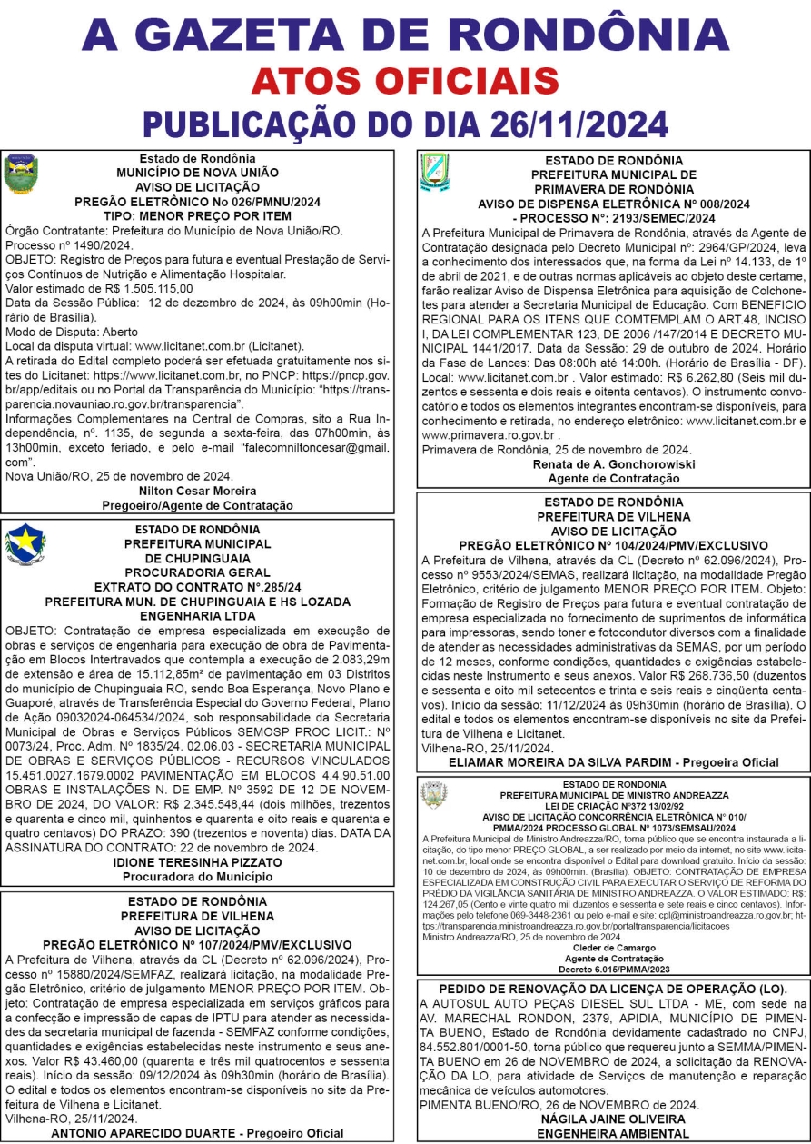 A GAZETA DE RONDÔNIA ATOS OFICIAIS PUBLICAÇÃO DO DIA 26/11/2024