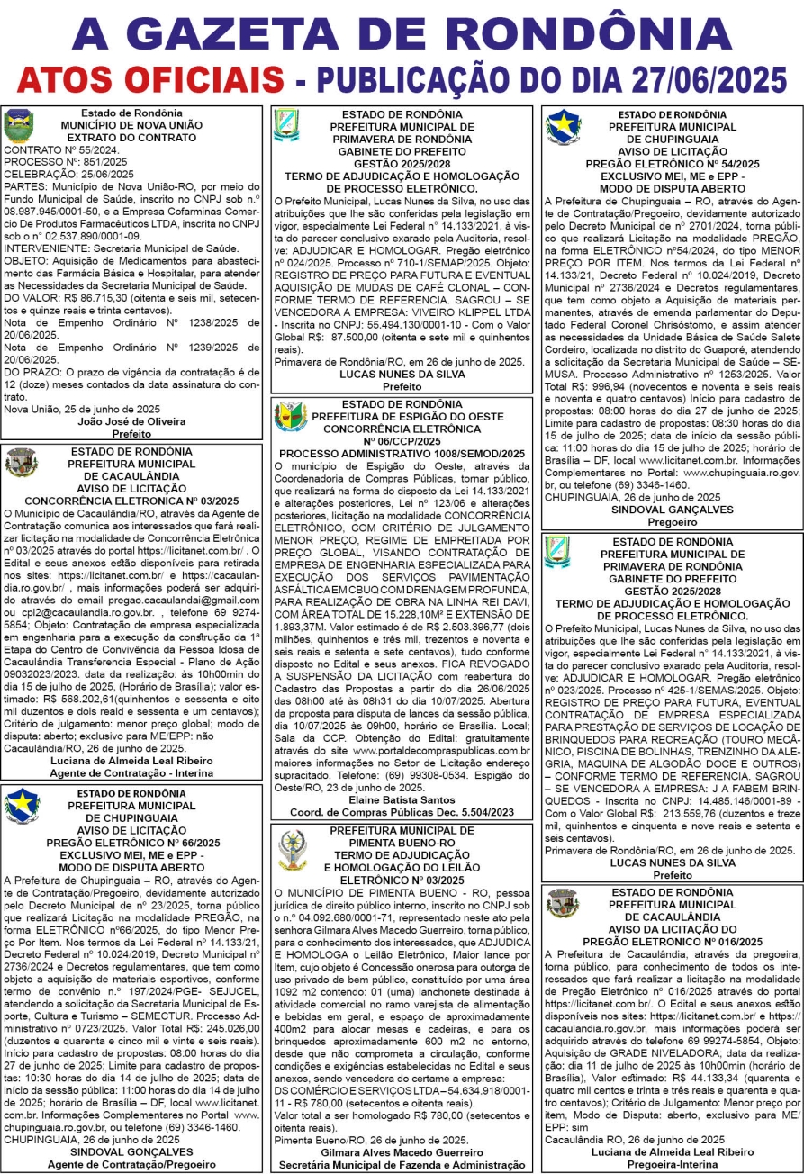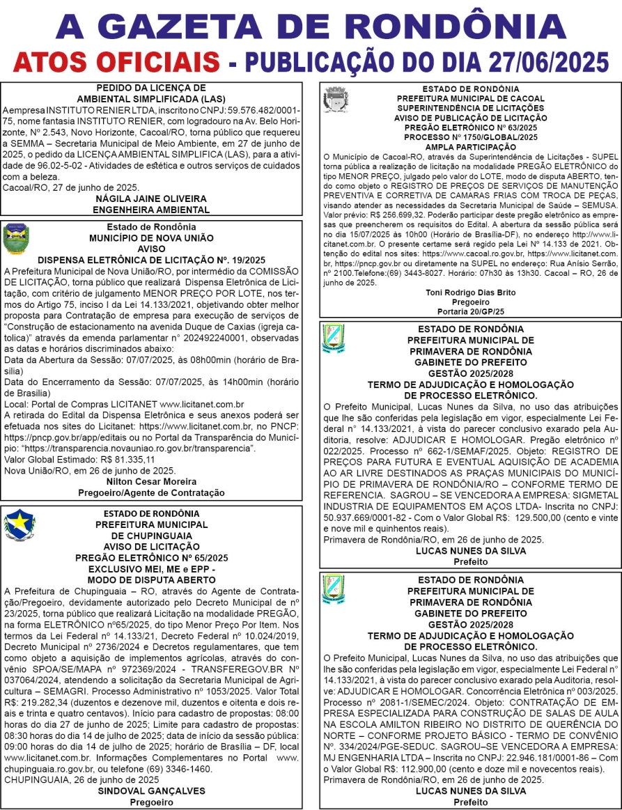 A GAZETA DE RONDÔNIA ATOS OFICIAIS PUBLICAÇÃO DO DIA 27/06/2025