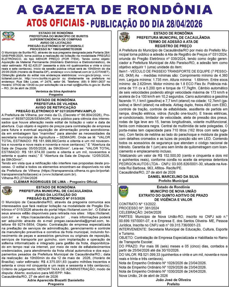 A GAZETA DE RONDÔNIA ATOS OFICIAIS PUBLICAÇÃO DO DIA 28/04/2026