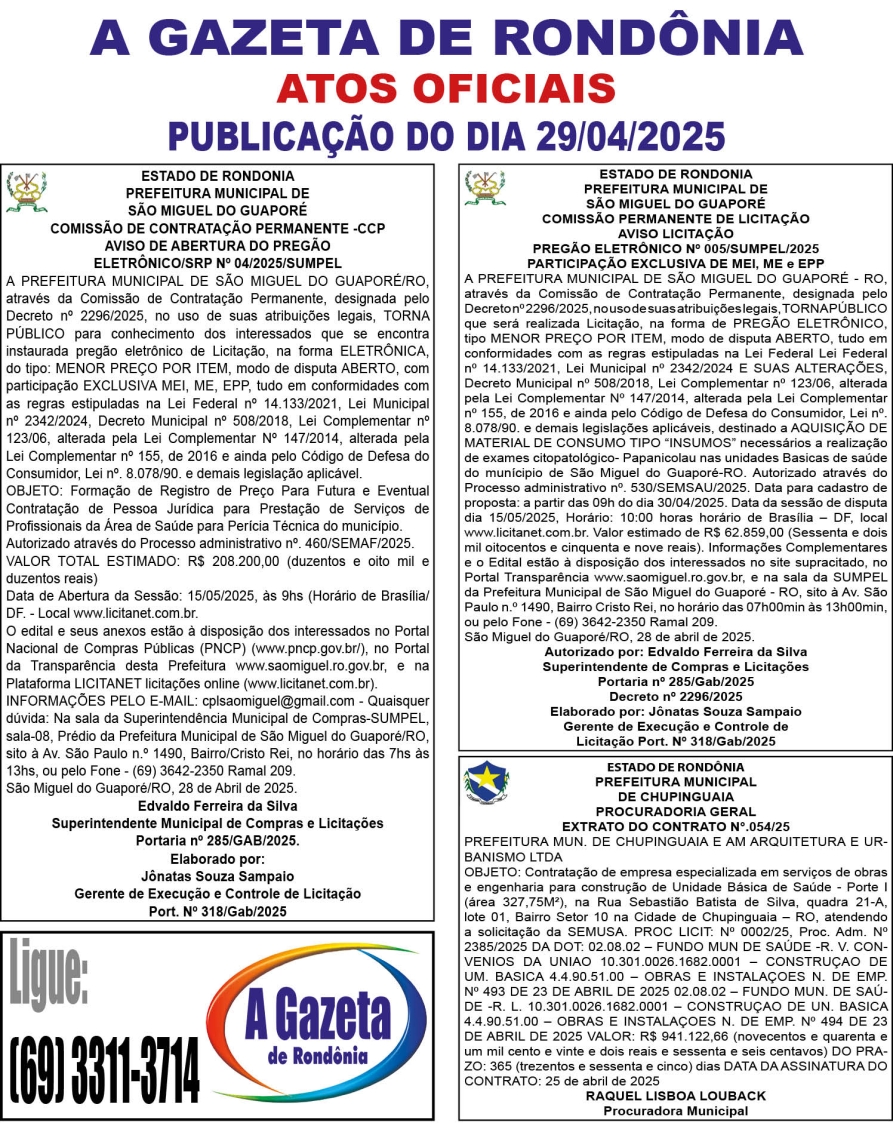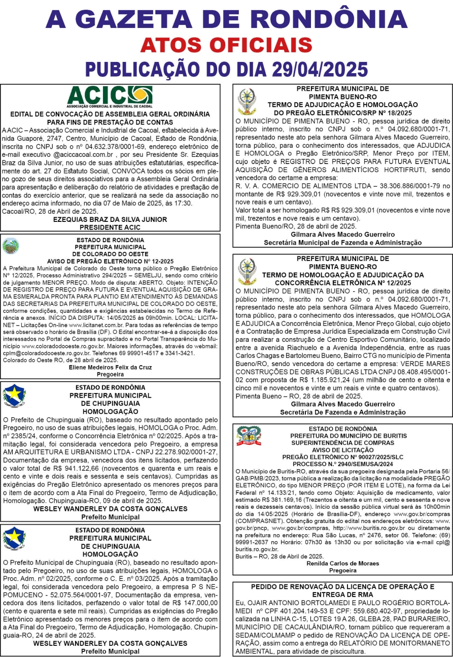 A GAZETA DE RONDÔNIA ATOS OFICIAIS PUBLICAÇÃO DO DIA 29/04/2025