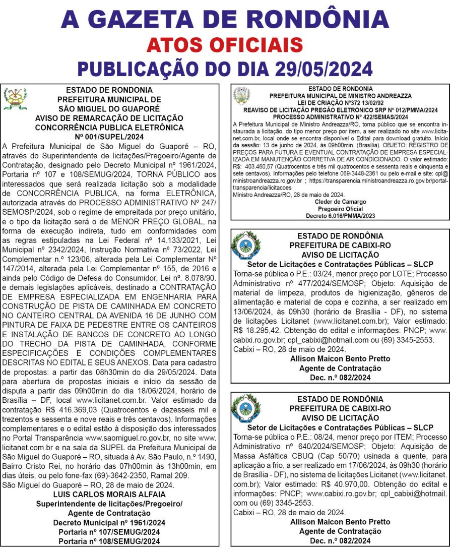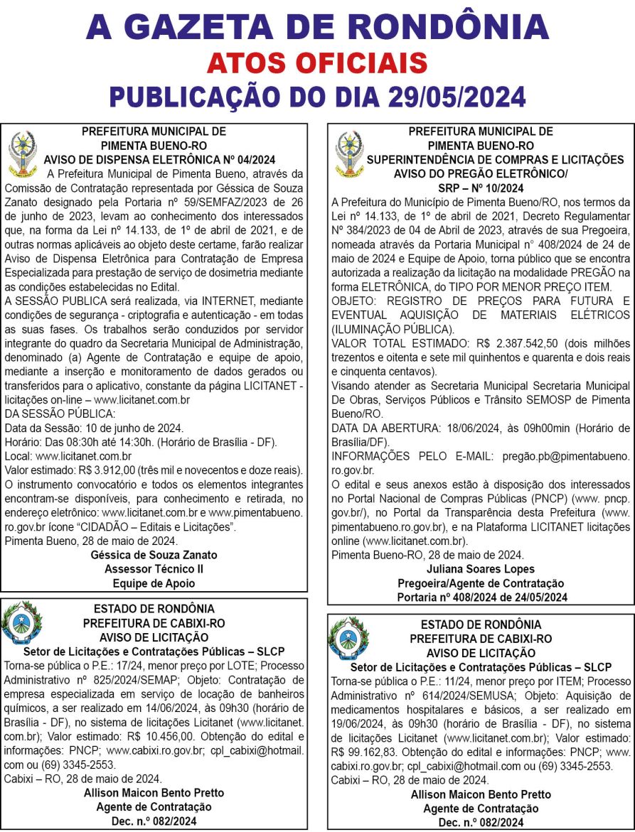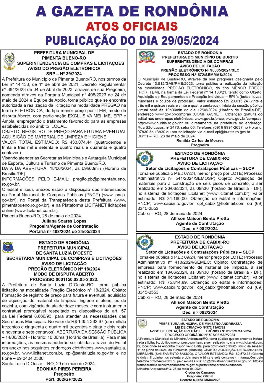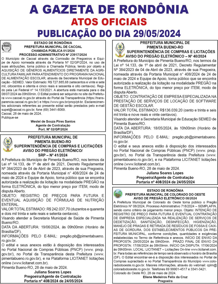 A GAZETA DE RONDÔNIA ATOS OFICIAIS PUBLICAÇÃO DO DIA 29/05/2024