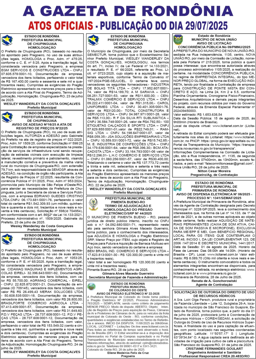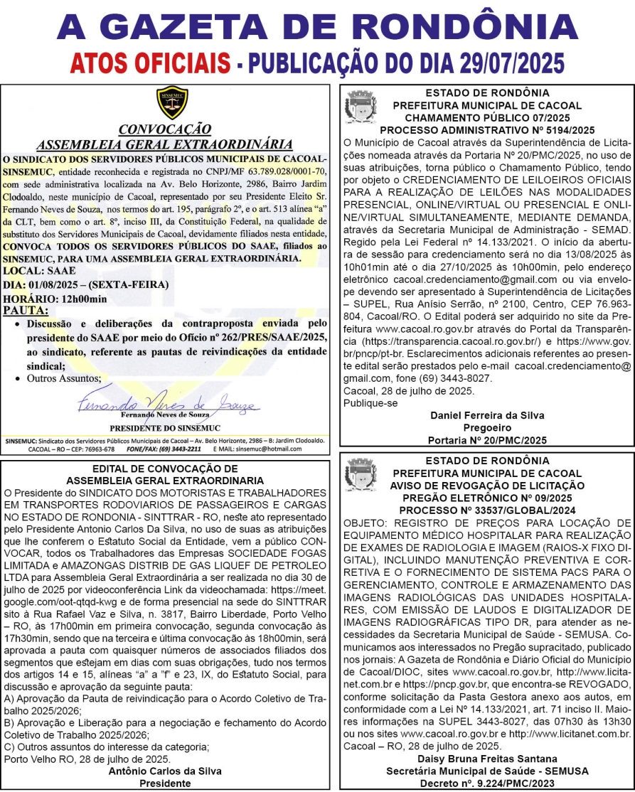 A GAZETA DE RONDÔNIA ATOS OFICIAIS PUBLICAÇÃO DO DIA 29/07/2025