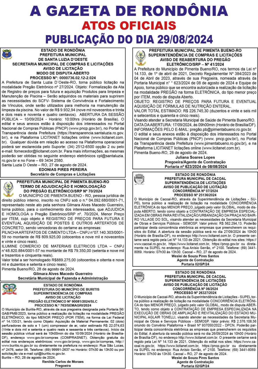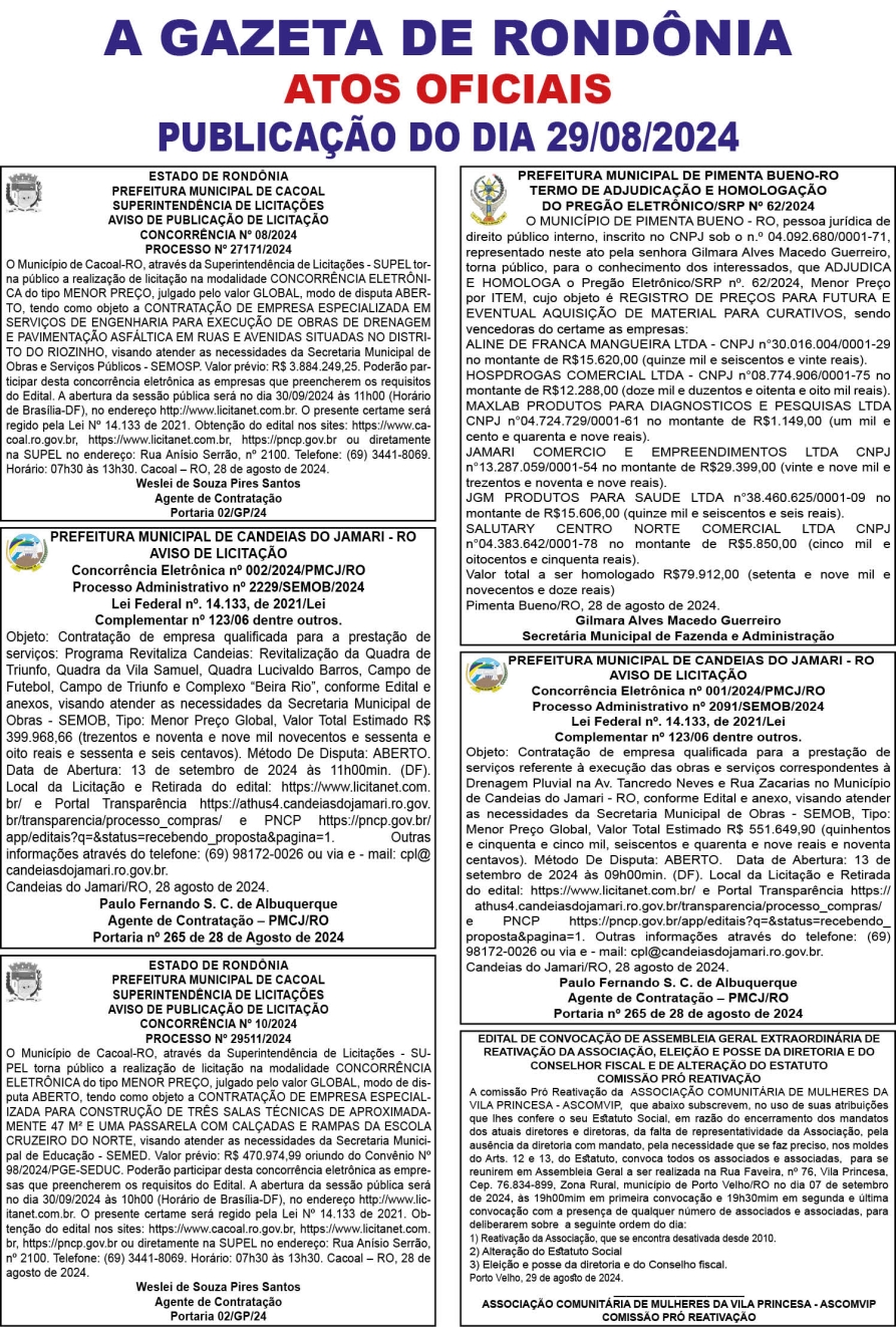 A GAZETA DE RONDÔNIA ATOS OFICIAIS PUBLICAÇÃO DO DIA 29/08/2024
