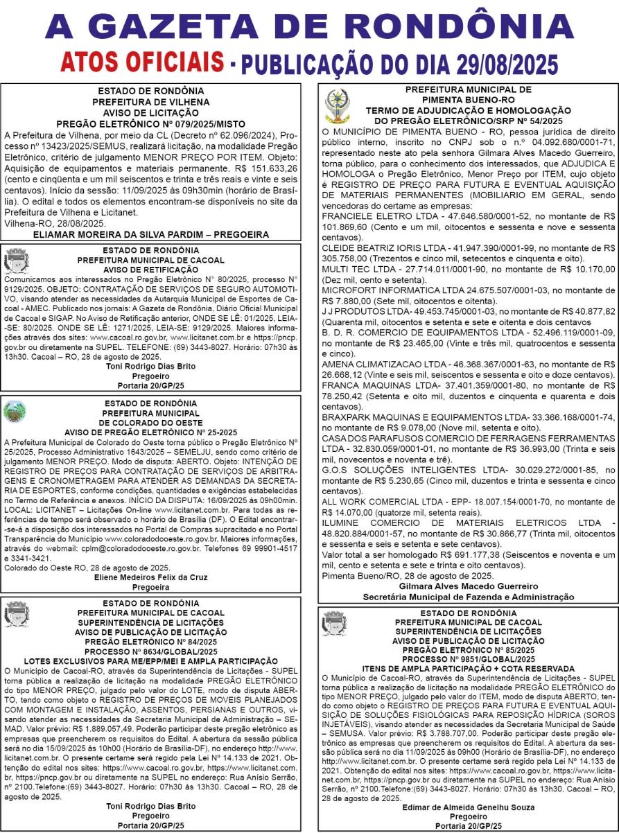 A GAZETA DE RONDÔNIA ATOS OFICIAIS PUBLICAÇÃO DO DIA 29/08/2025