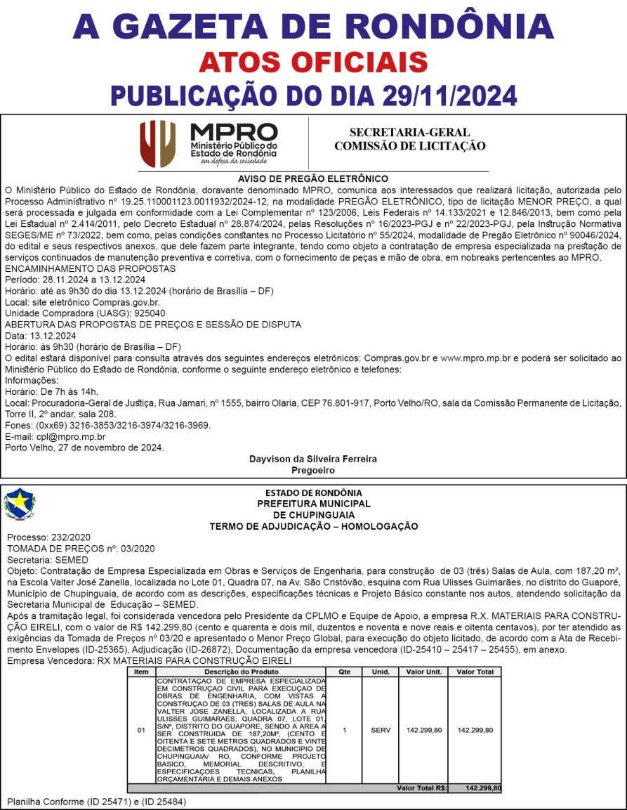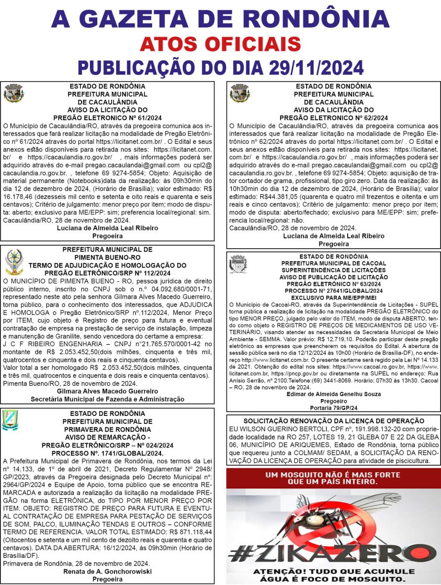 A GAZETA DE RONDÔNIA ATOS OFICIAIS PUBLICAÇÃO DO DIA 29/11/2024