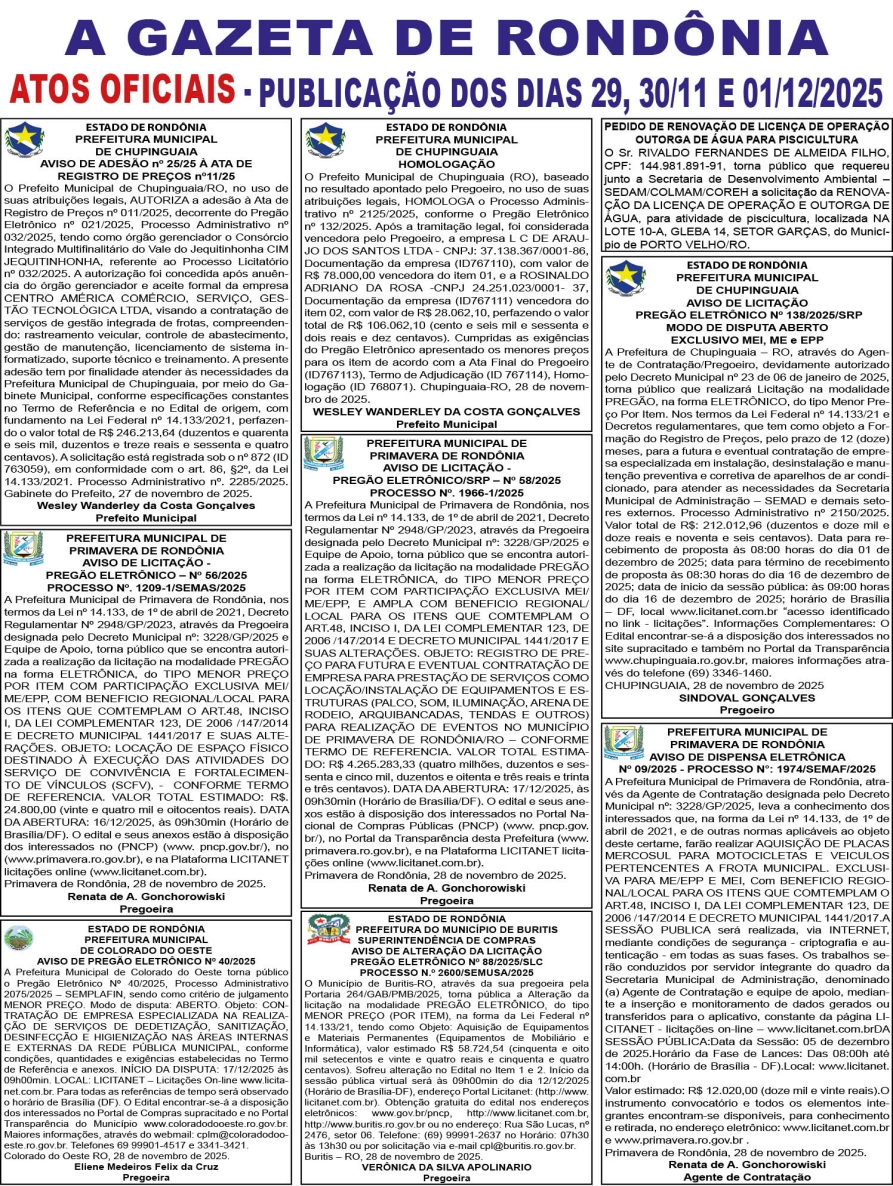 A GAZETA DE RONDÔNIA ATOS OFICIAIS PUBLICAÇÃO DOS DIAS 29, 30/11 E 01/12/2025