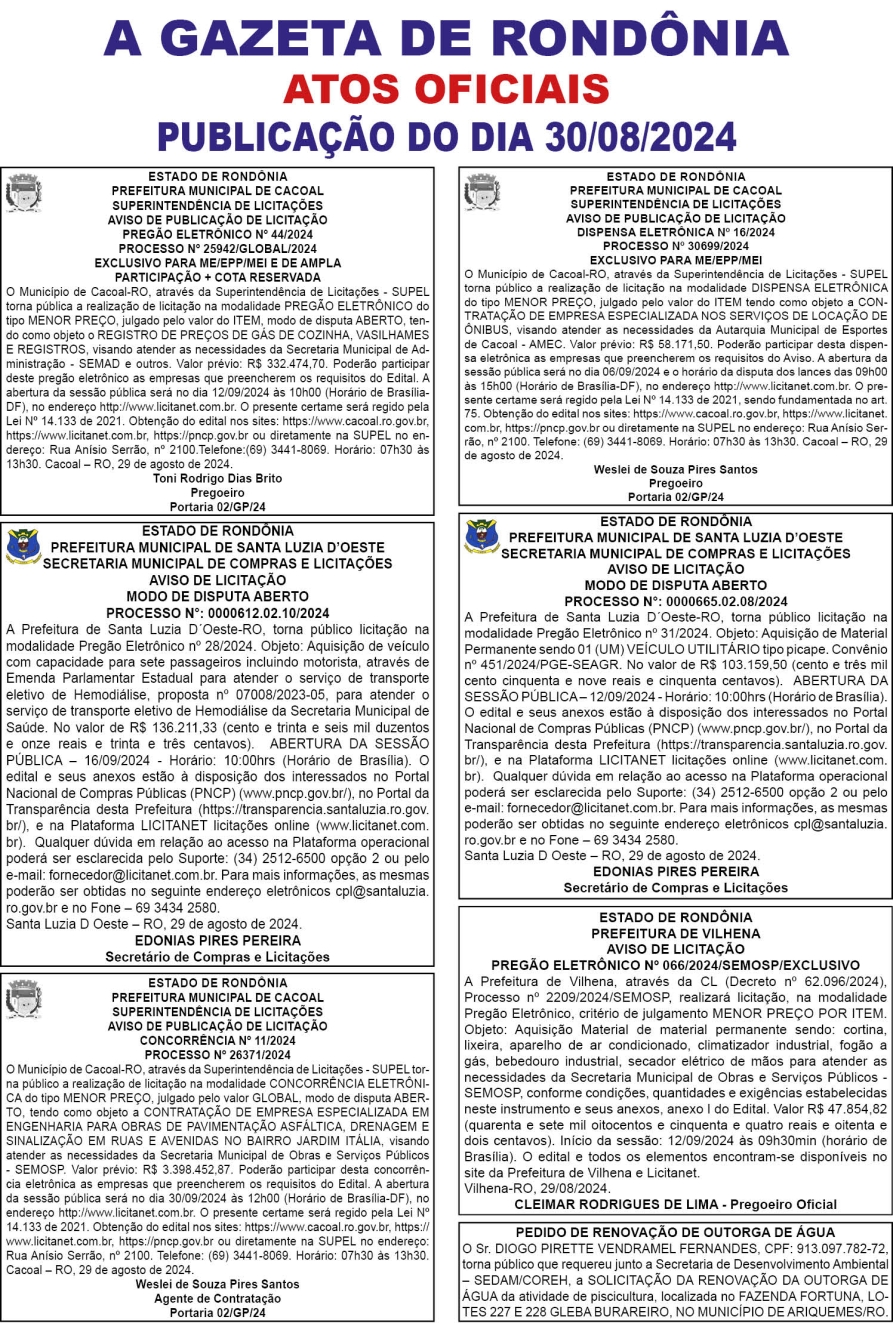 A GAZETA DE RONDÔNIA ATOS OFICIAIS PUBLICAÇÃO DO DIA 30/08/2024