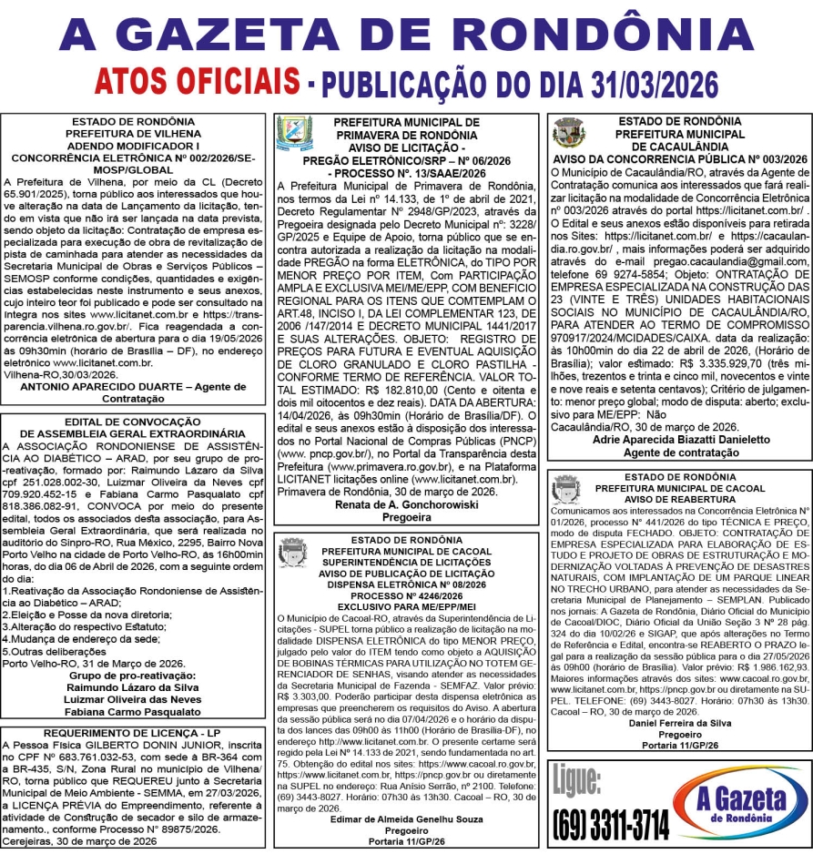 A GAZETA DE RONDÔNIA ATOS OFICIAIS PUBLICAÇÃO DO DIA 31/03/2026