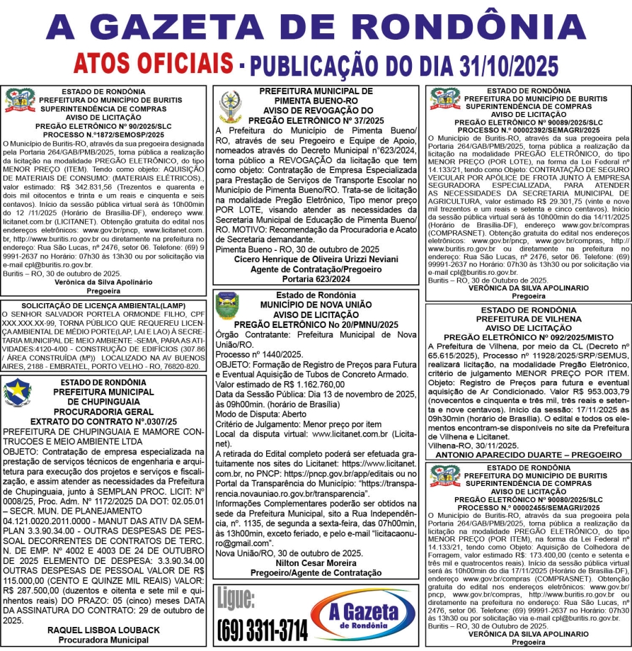 A GAZETA DE RONDÔNIA ATOS OFICIAIS PUBLICAÇÃO DO DIA 31/10/2025