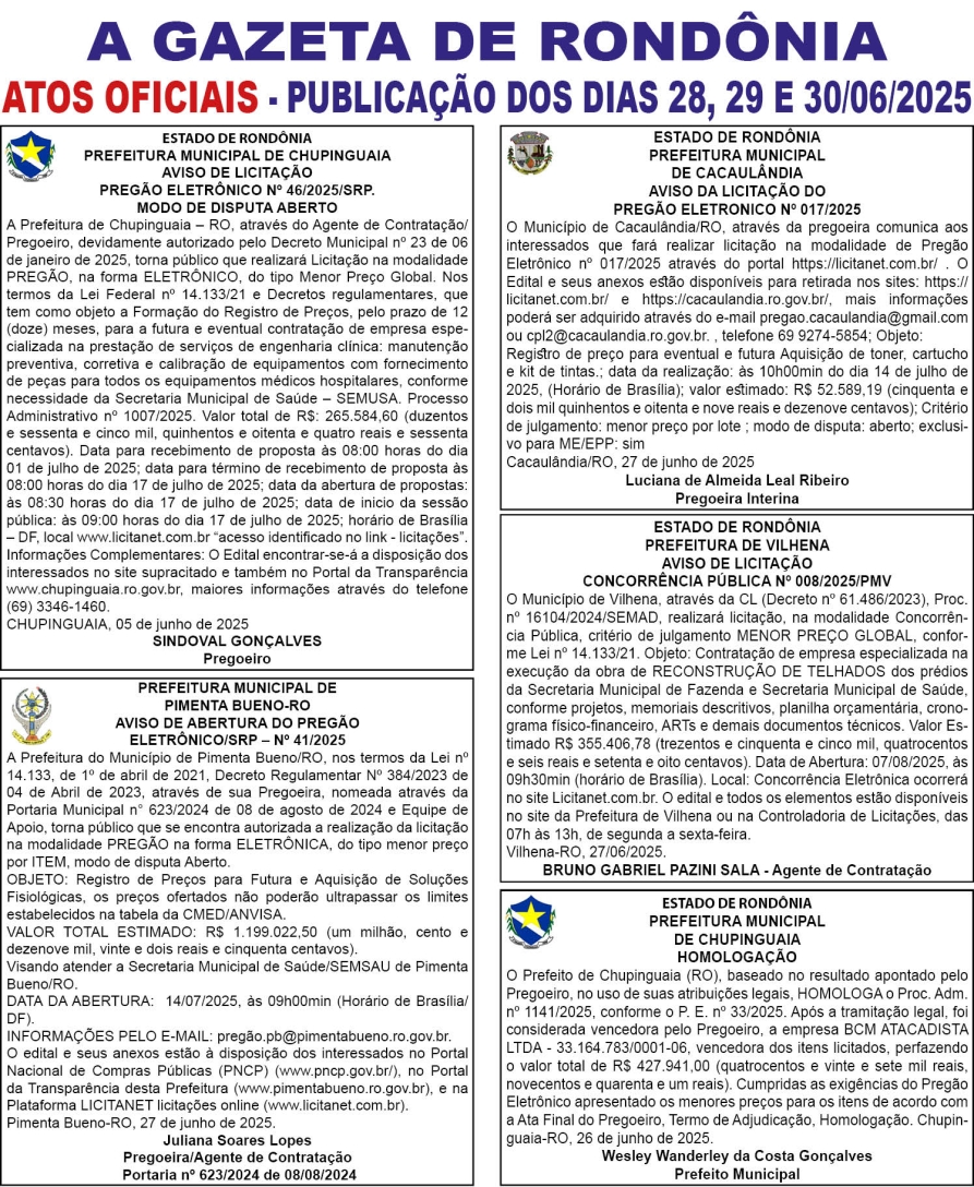 A GAZETA DE RONDÔNIA ATOS OFICIAIS PUBLICAÇÃO DO DIAS 28, 29 E 30/06/2025