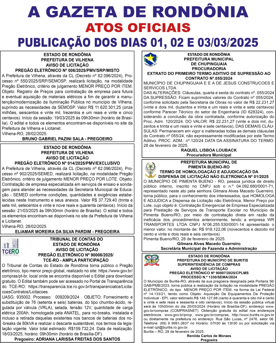 A GAZETA DE RONDÔNIA ATOS OFICIAIS PUBLICAÇÃO DOS DIAS 01, 02 E 03/03/2025
