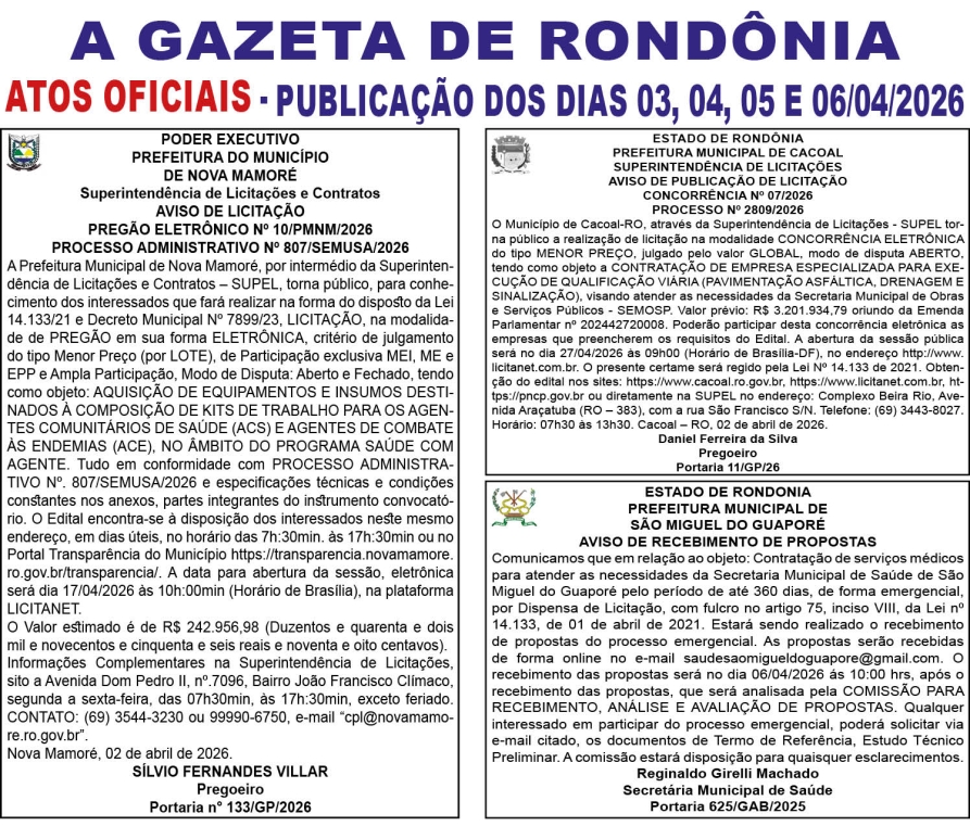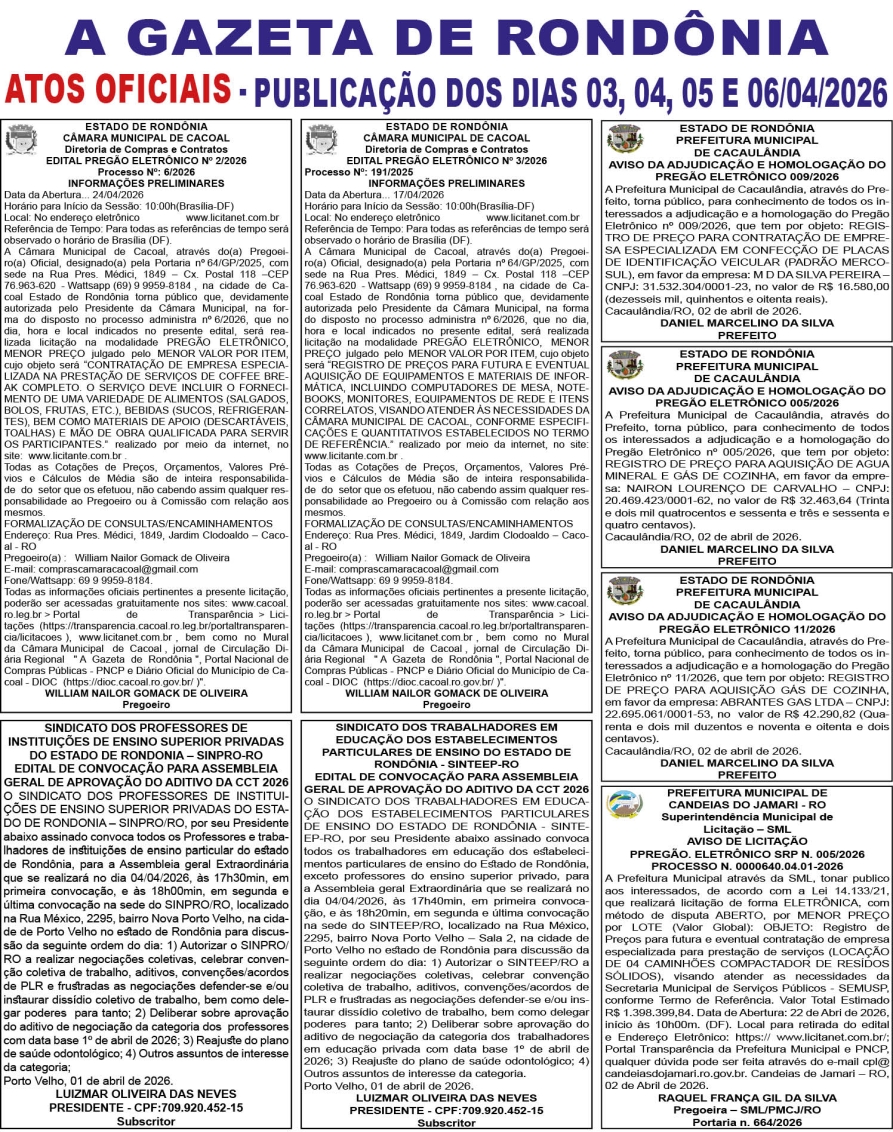 A GAZETA DE RONDÔNIA ATOS OFICIAIS PUBLICAÇÃO DOS DIAS 03, 04, 05 E 06/04/2026