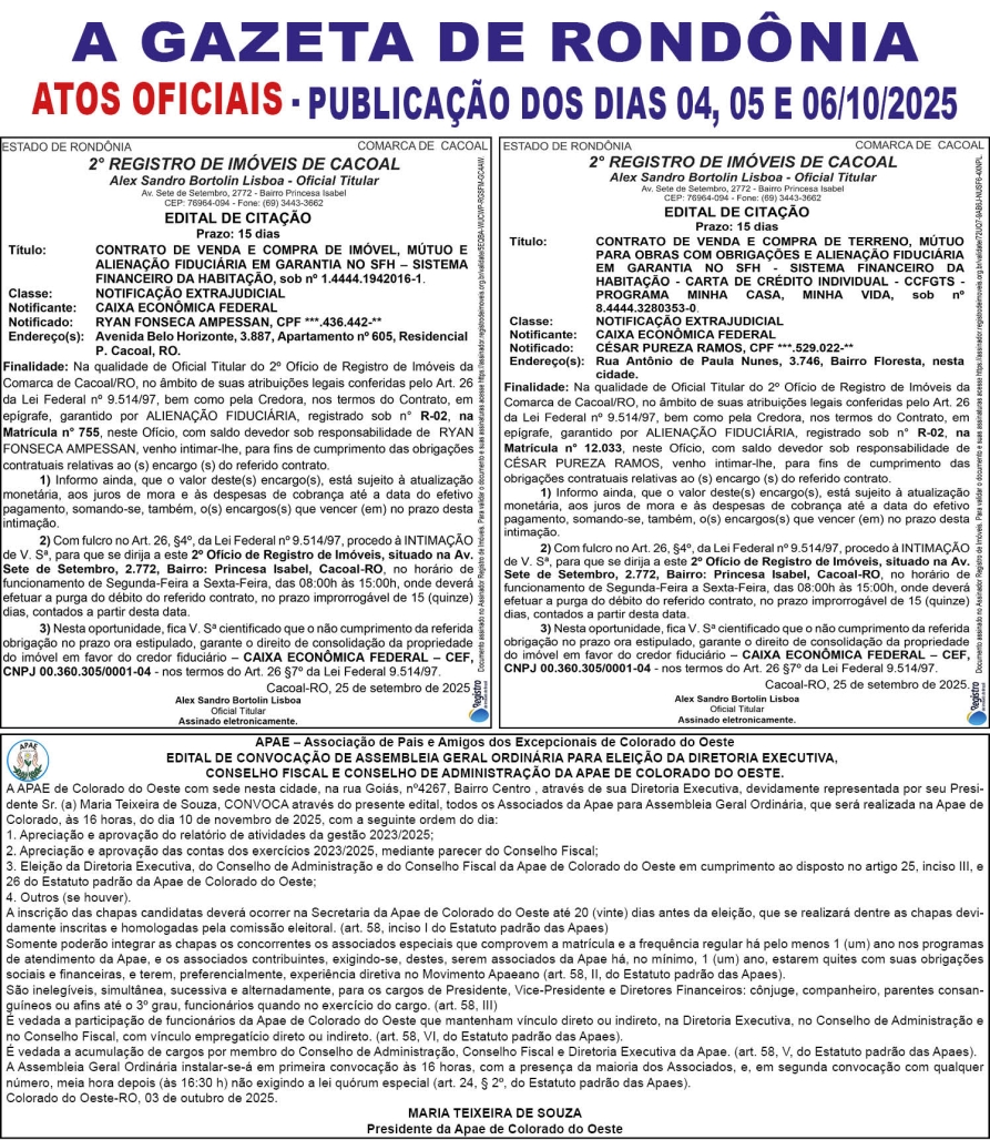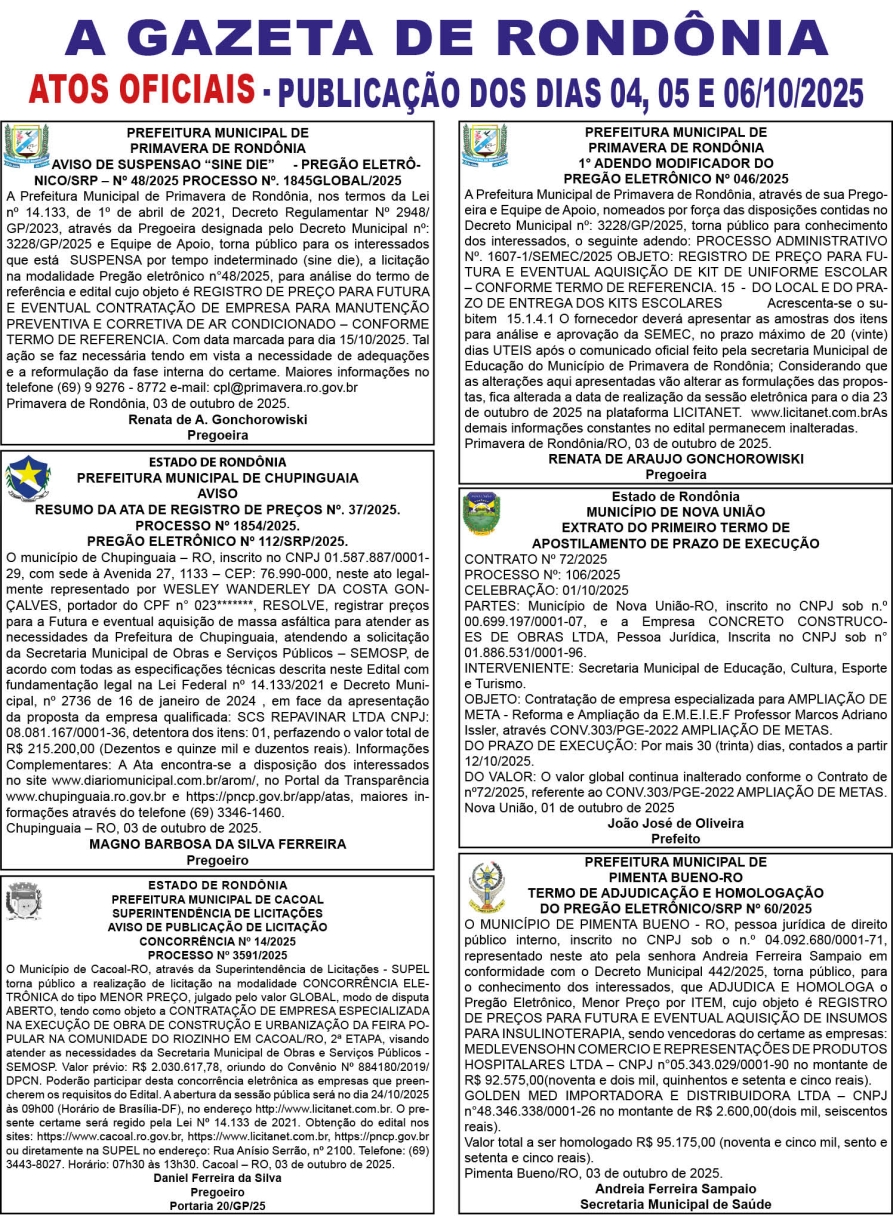 A GAZETA DE RONDÔNIA ATOS OFICIAIS PUBLICAÇÃO DOS DIAS 04, 05 E 06/10/2025