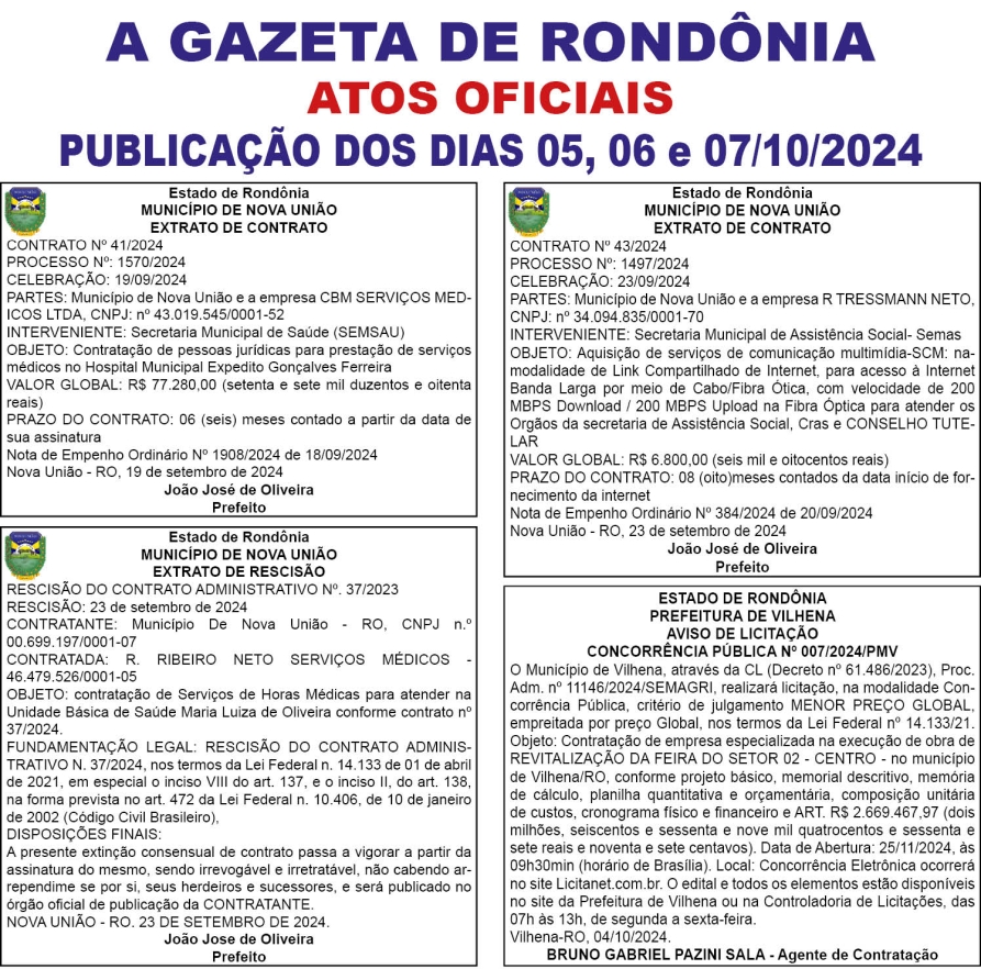 A GAZETA DE RONDÔNIA ATOS OFICIAIS PUBLICAÇÃO DOS DIAS 05, 06 e 07/10/2024