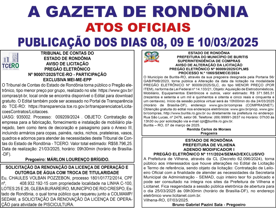 A GAZETA DE RONDÔNIA ATOS OFICIAIS PUBLICAÇÃO DOS DIAS 08, 09 E 10/03/2025