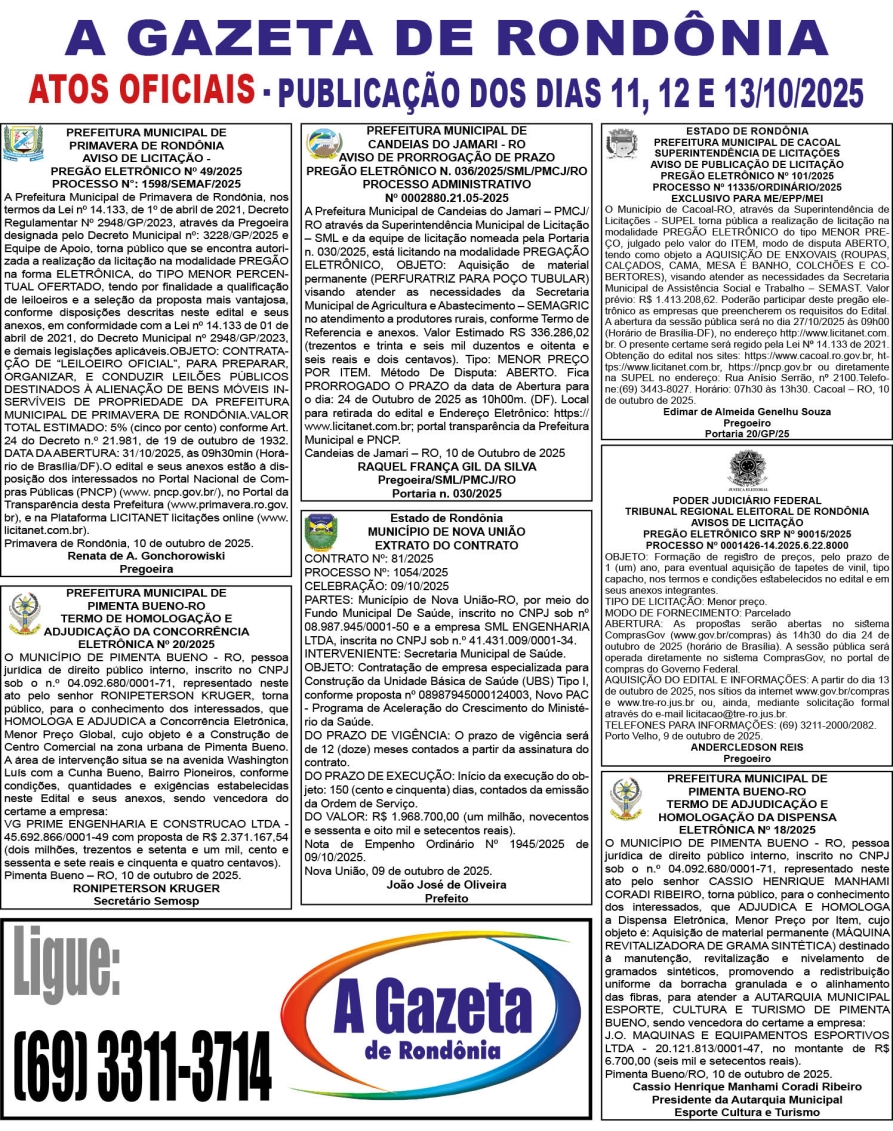 A GAZETA DE RONDÔNIA ATOS OFICIAIS PUBLICAÇÃO DOS DIAS 11, 12 E 13/10/2025