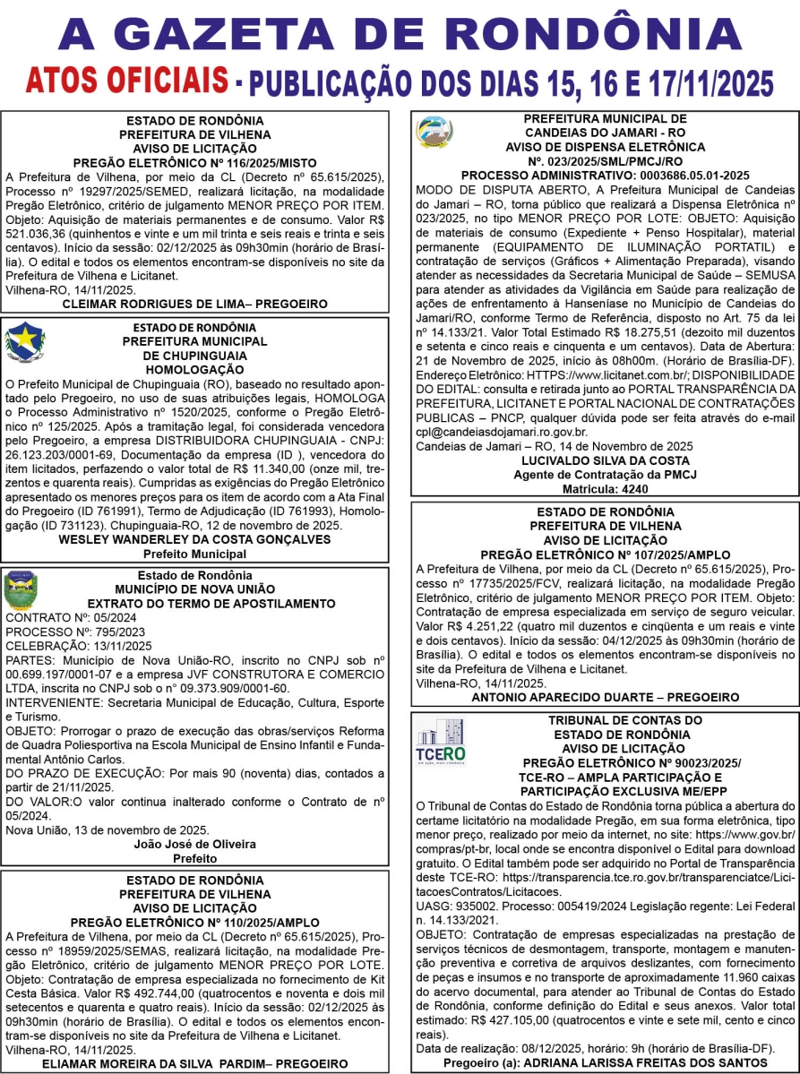 A GAZETA DE RONDÔNIA ATOS OFICIAIS PUBLICAÇÃO DOS DIAS 15, 16 E 17/12/2025