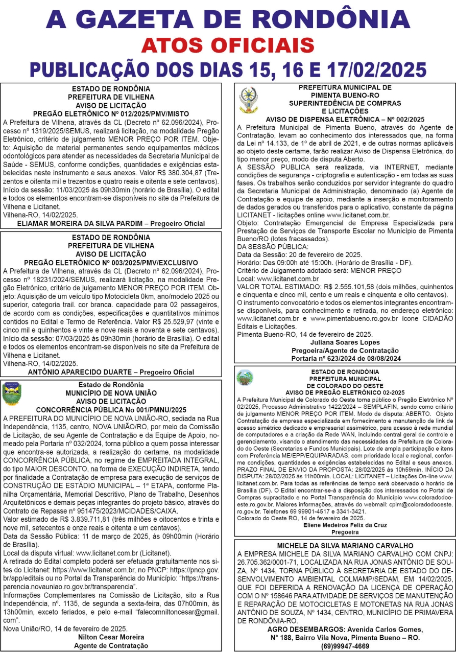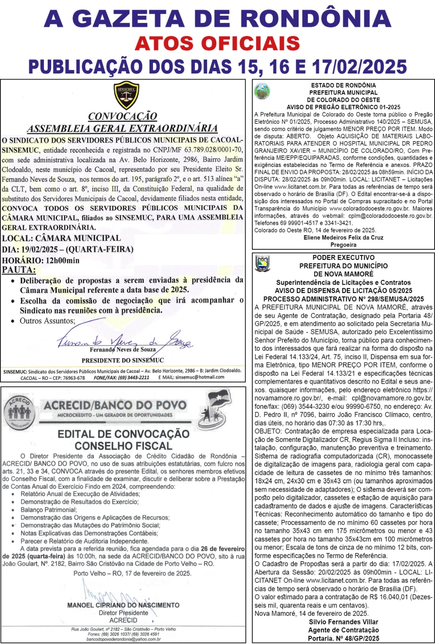 A GAZETA DE RONDÔNIA ATOS OFICIAIS PUBLICAÇÃO DOS DIAS 15, 16 E 17/02/2025