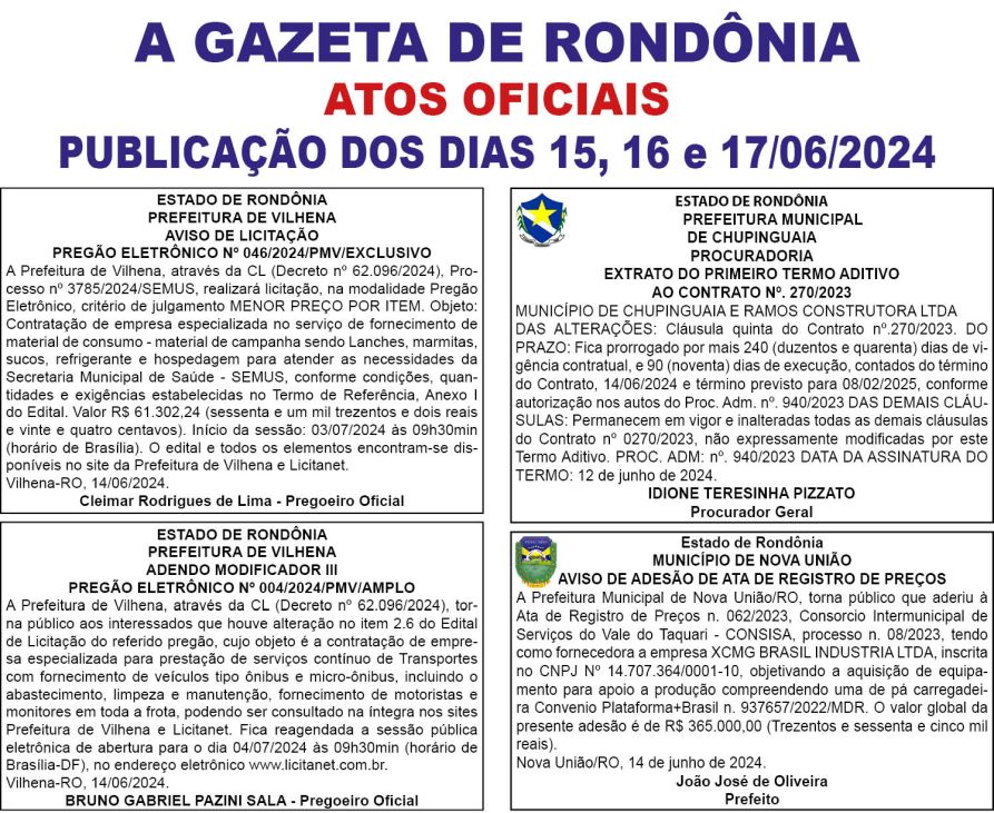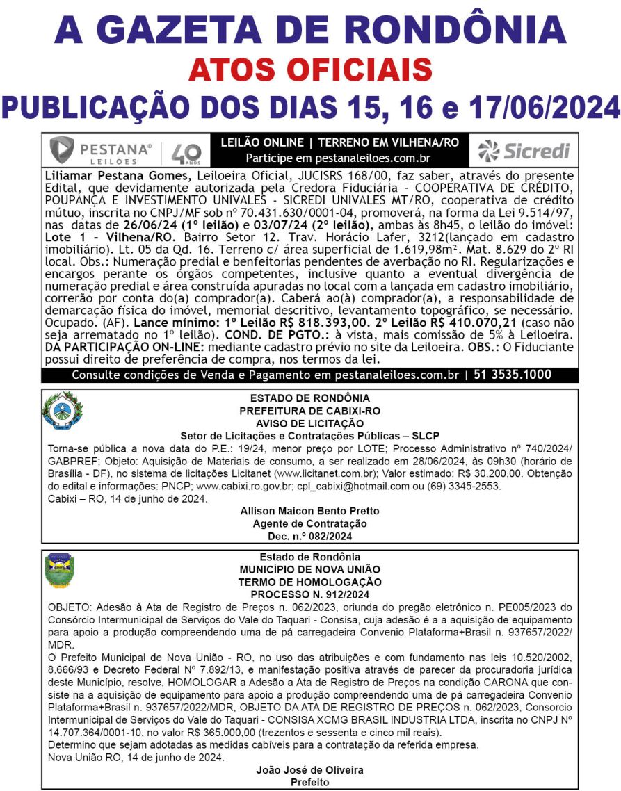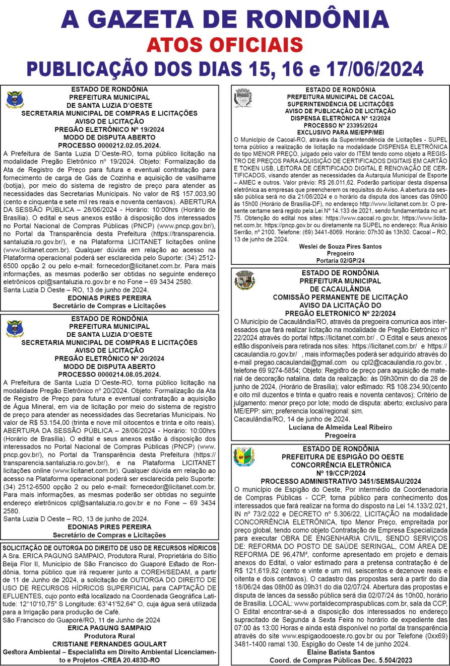 A GAZETA DE RONDÔNIA ATOS OFICIAIS PUBLICAÇÃO DOS DIAS 15, 16 e 17/06/2024
