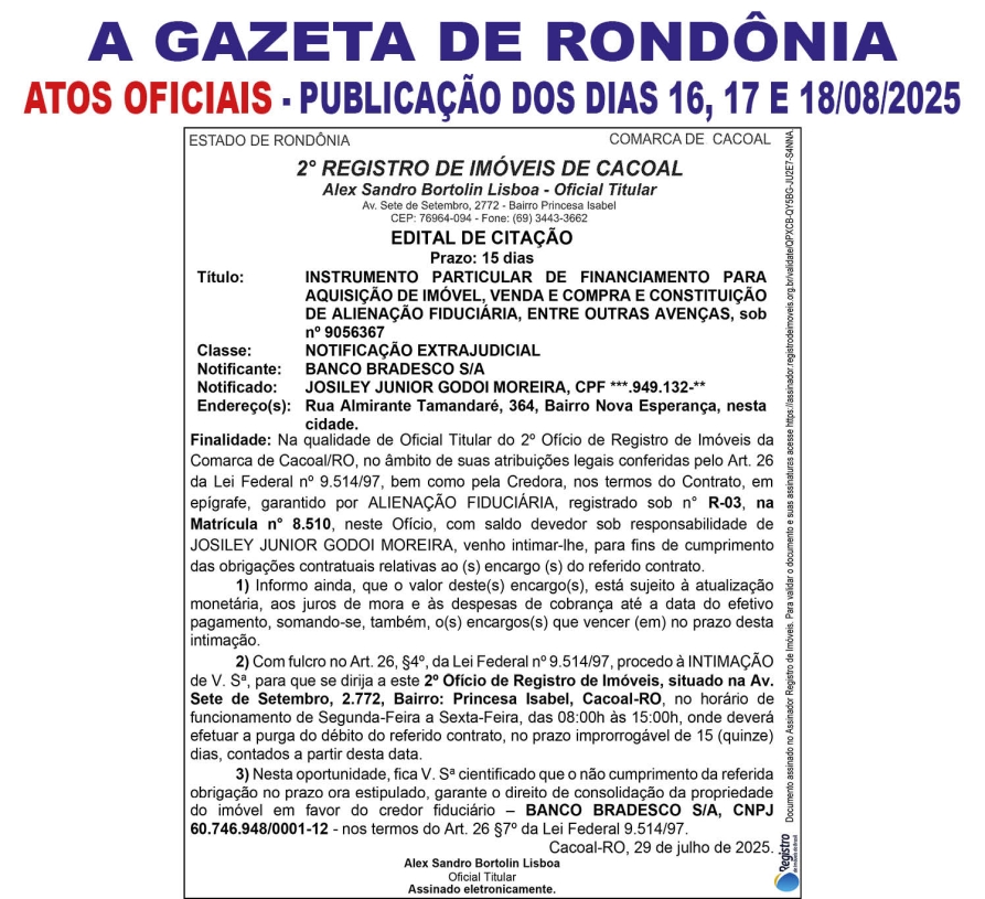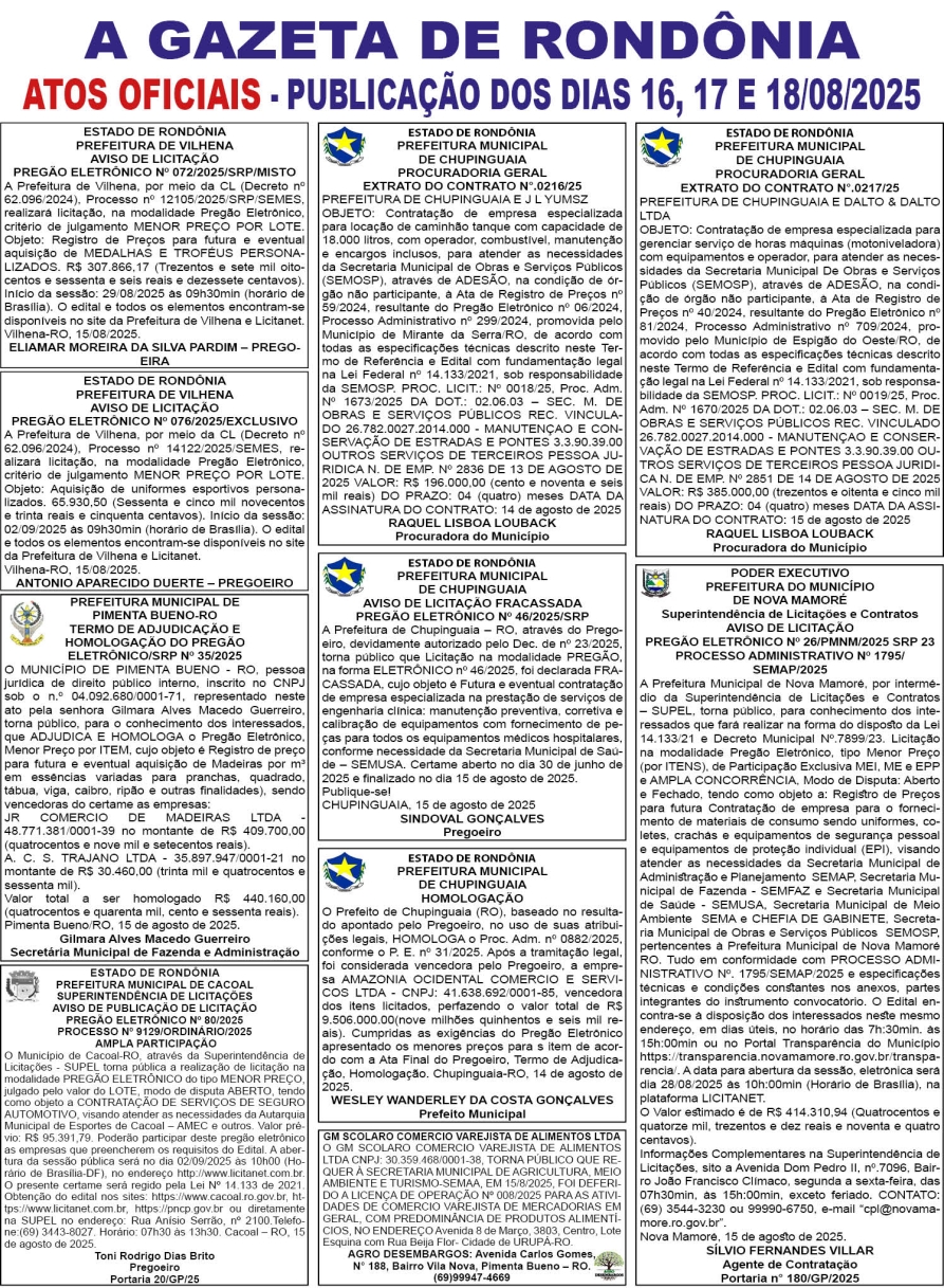 A GAZETA DE RONDÔNIA ATOS OFICIAIS PUBLICAÇÃO DOS DIAS 16, 17 E 18/08/2025