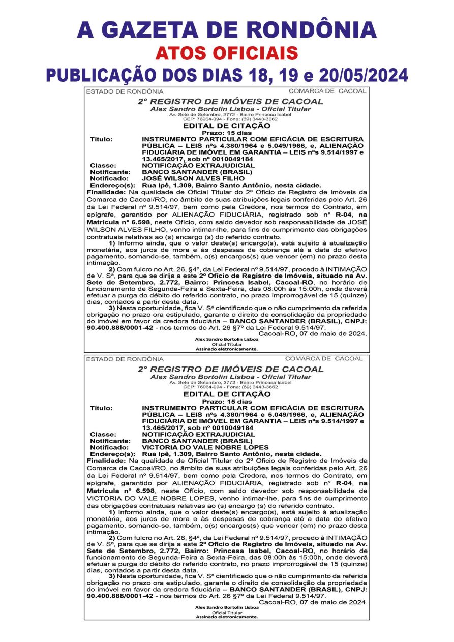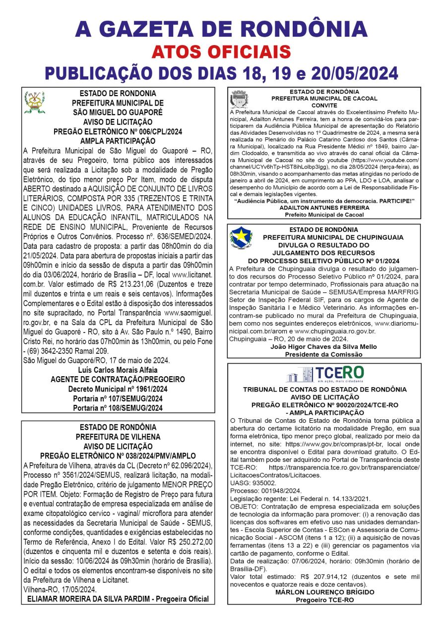 A GAZETA DE RONDÔNIA ATOS OFICIAIS PUBLICAÇÃO DOS DIAS 18, 19 e 20/05/2024