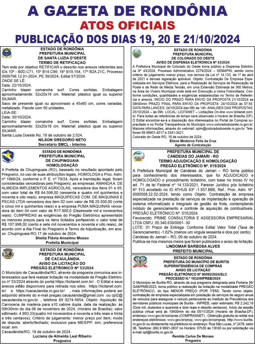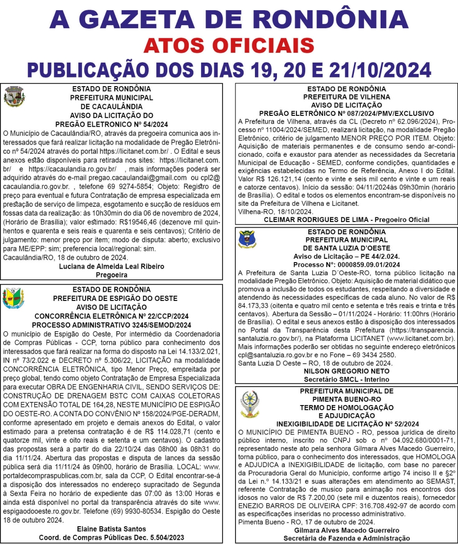 A GAZETA DE RONDÔNIA ATOS OFICIAIS PUBLICAÇÃO DOS DIAS 19, 20 E 21/10/2024
