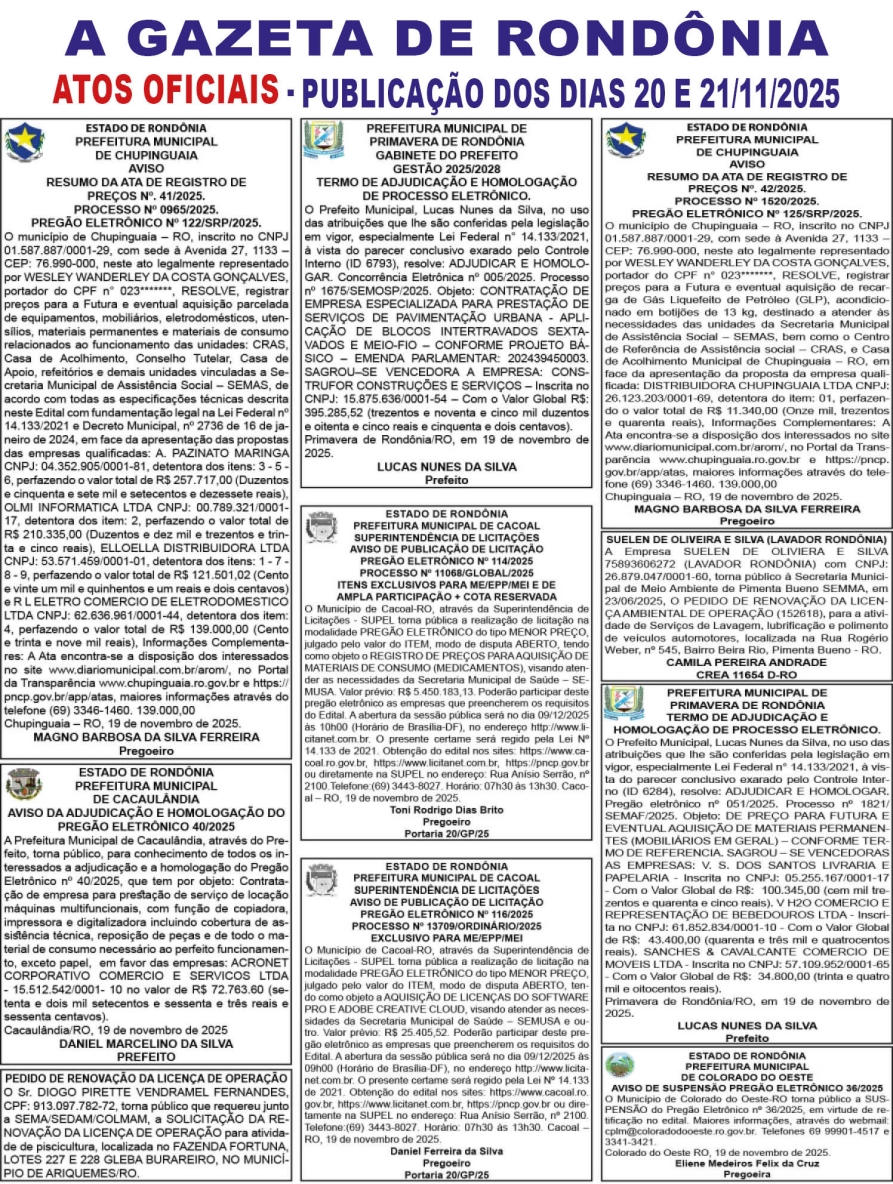 A GAZETA DE RONDÔNIA ATOS OFICIAIS PUBLICAÇÃO DOS DIAS 20 E 21/11/2025