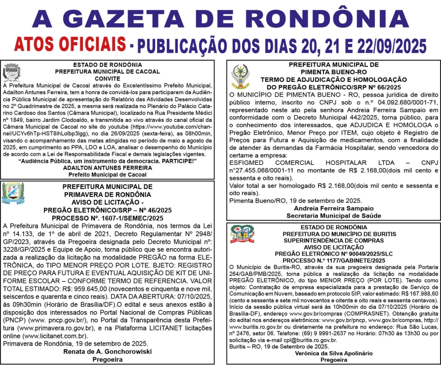 A GAZETA DE RONDÔNIA ATOS OFICIAIS PUBLICAÇÃO DOS DIAS 20, 21 E 22/09/2025