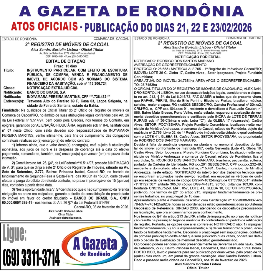A GAZETA DE RONDÔNIA ATOS OFICIAIS PUBLICAÇÃO DOS DIAS 21, 22 E 23/02/2026