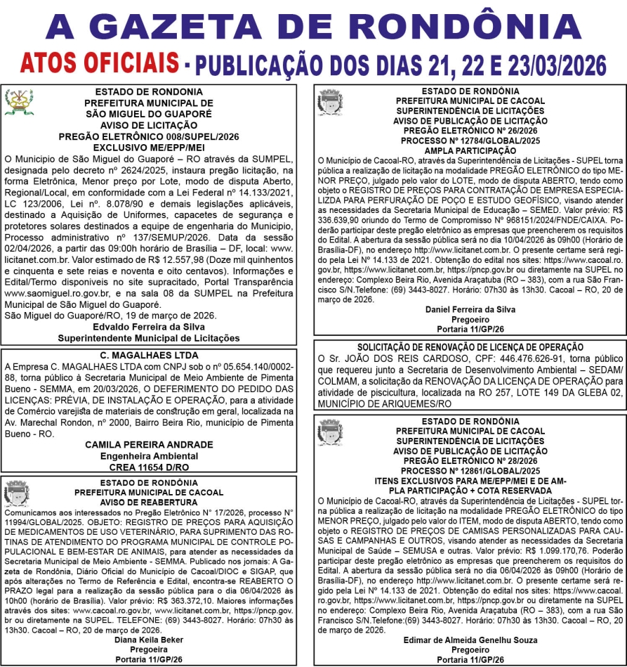 A GAZETA DE RONDÔNIA ATOS OFICIAIS PUBLICAÇÃO DOS DIAS 21, 22 E 23/03/2026
