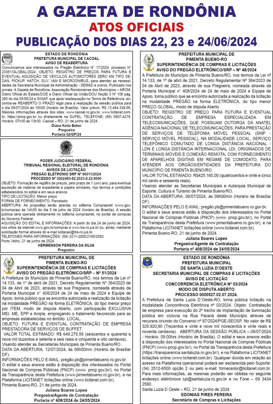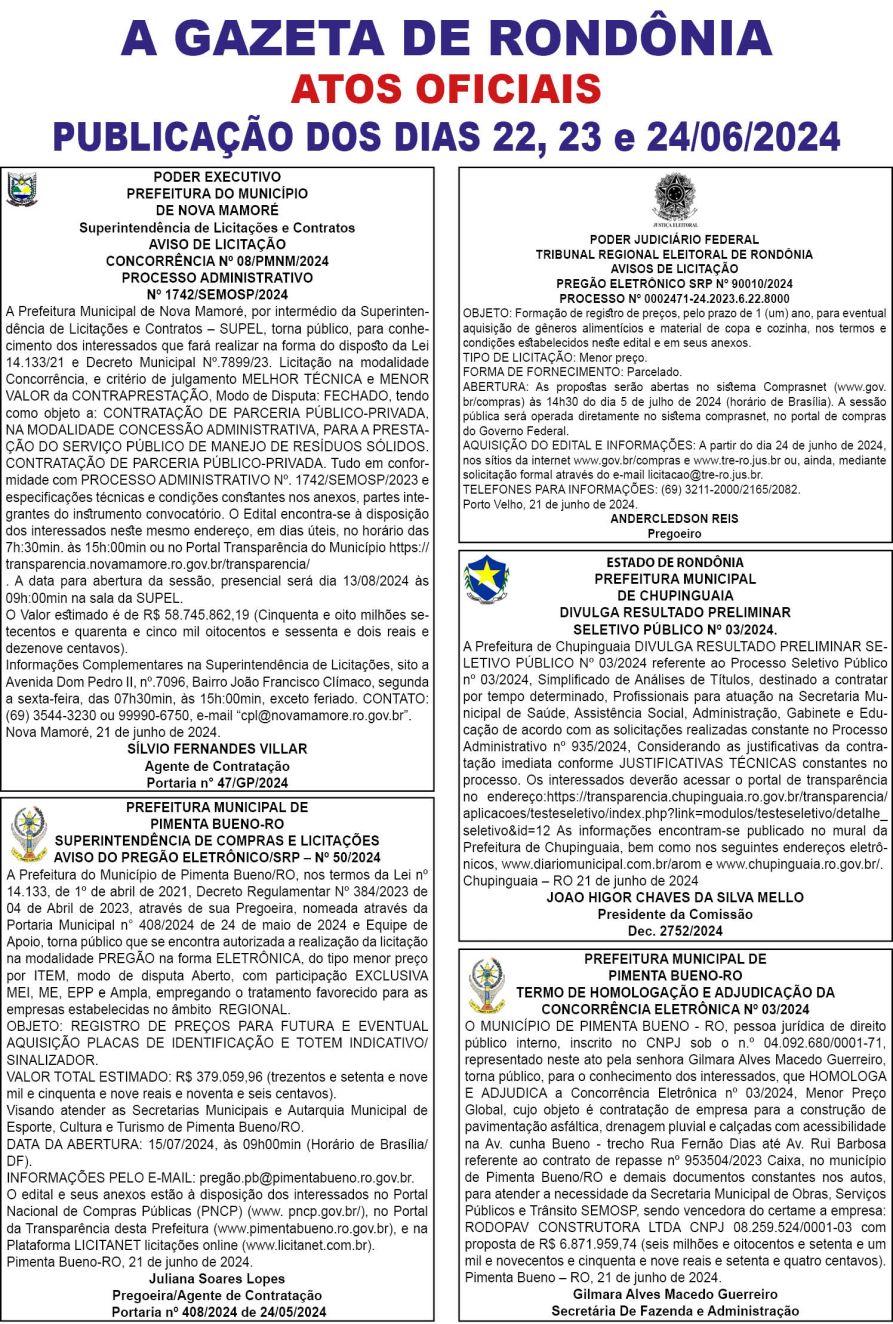 A GAZETA DE RONDÔNIA ATOS OFICIAIS PUBLICAÇÃO DOS DIAS 22, 23 e 24/06/2024