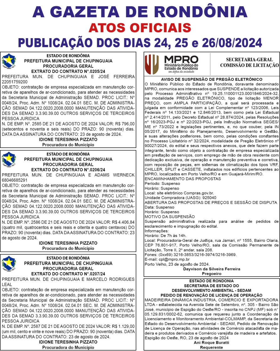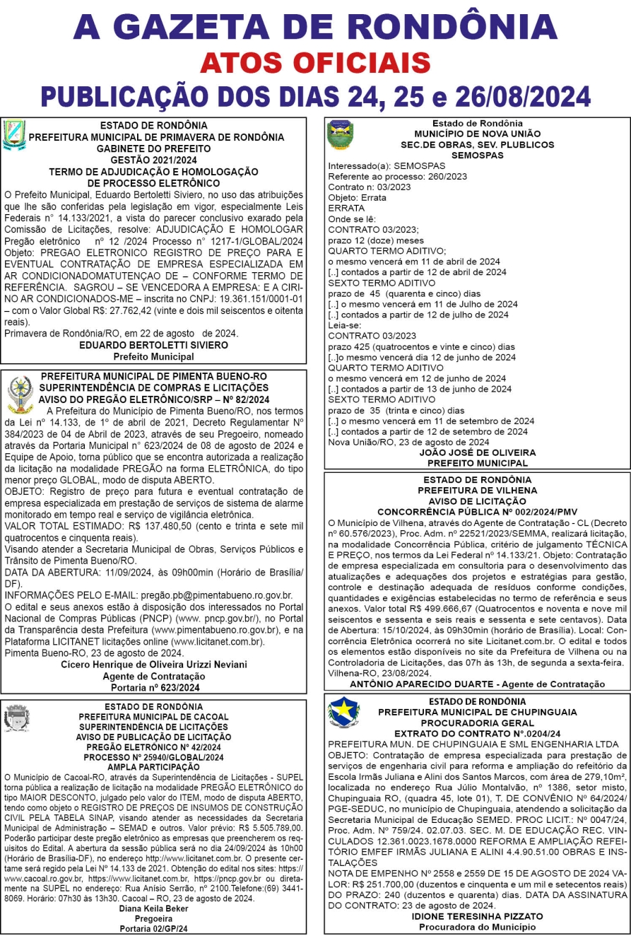 A GAZETA DE RONDÔNIA ATOS OFICIAIS PUBLICAÇÃO DOS DIAS 24, 25 E 26/08/2024