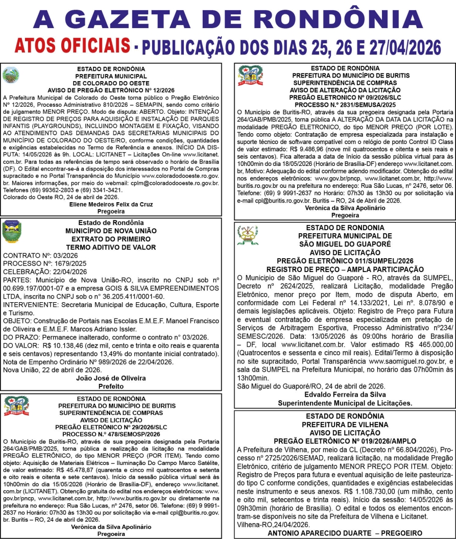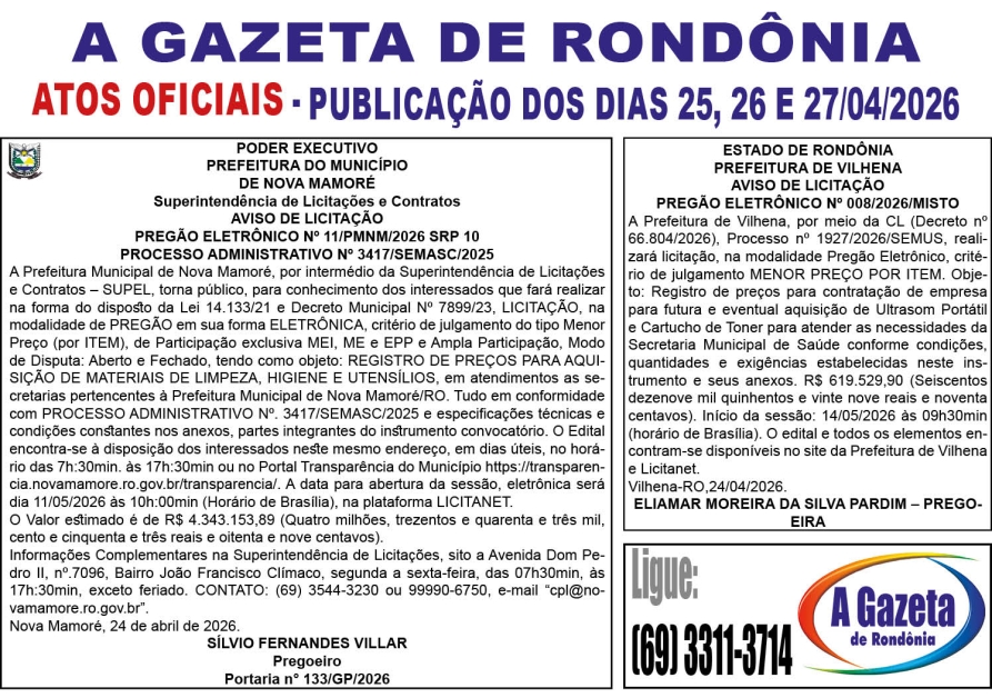 A GAZETA DE RONDÔNIA ATOS OFICIAIS PUBLICAÇÃO DOS DIAS 25, 26 E 27/04/2026