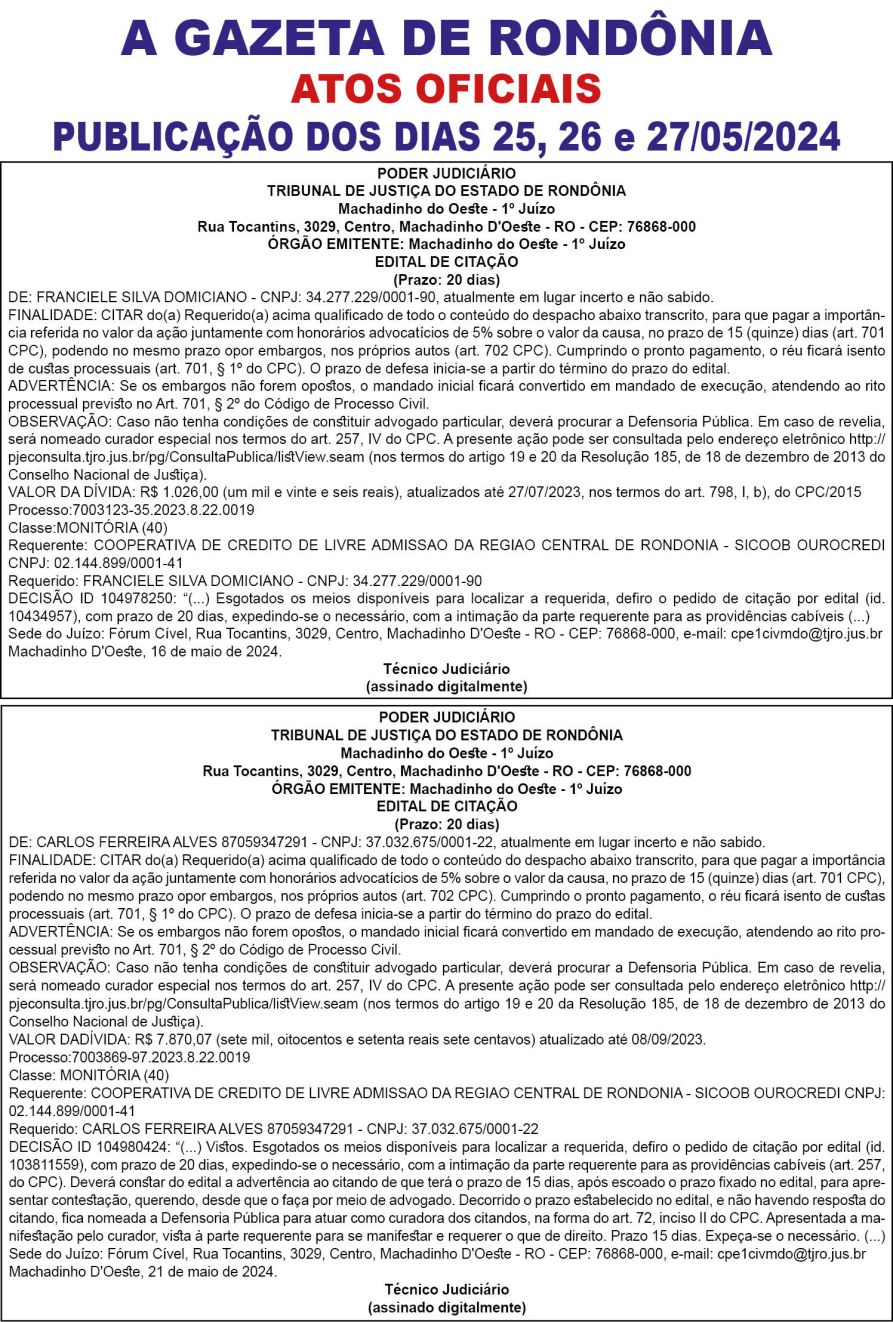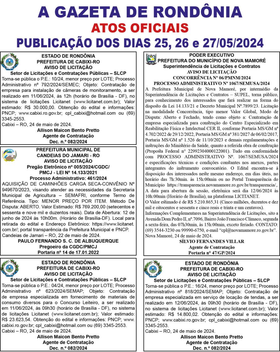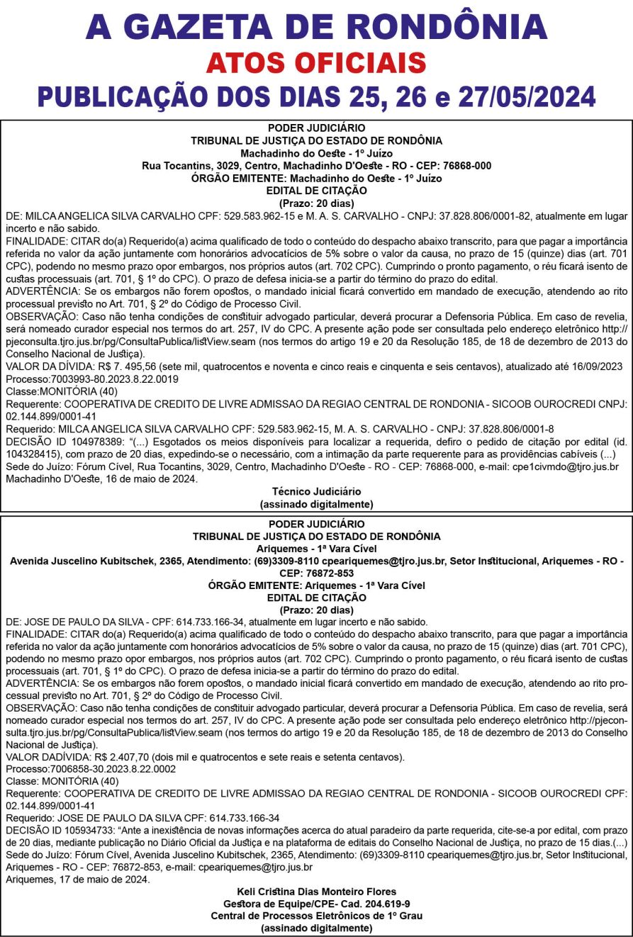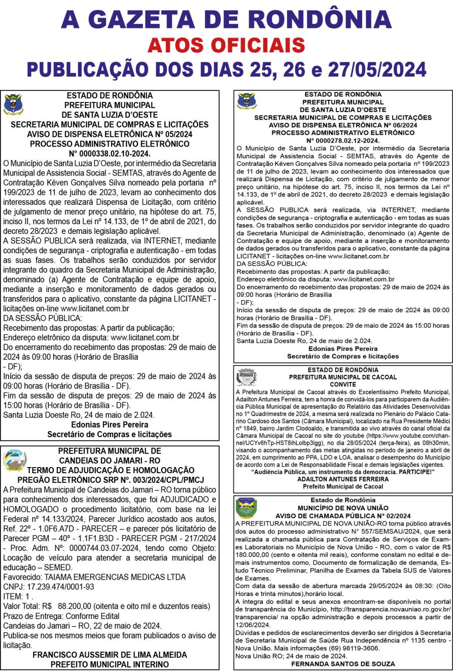 A GAZETA DE RONDÔNIA ATOS OFICIAIS PUBLICAÇÃO DOS DIAS 25, 26 e 27/05/2024