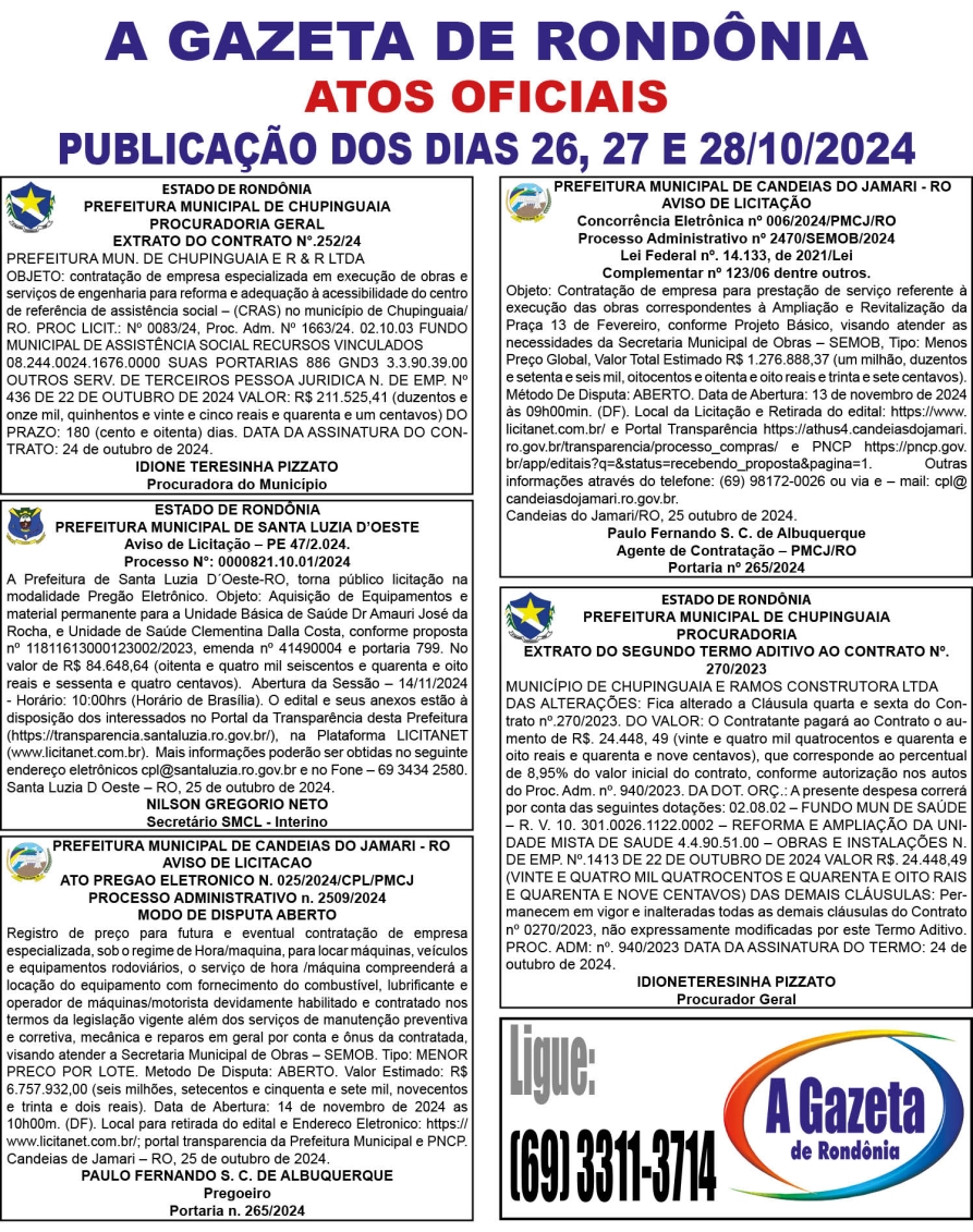 A GAZETA DE RONDÔNIA ATOS OFICIAIS PUBLICAÇÃO DOS DIAS 26, 27 E 28/10/2024