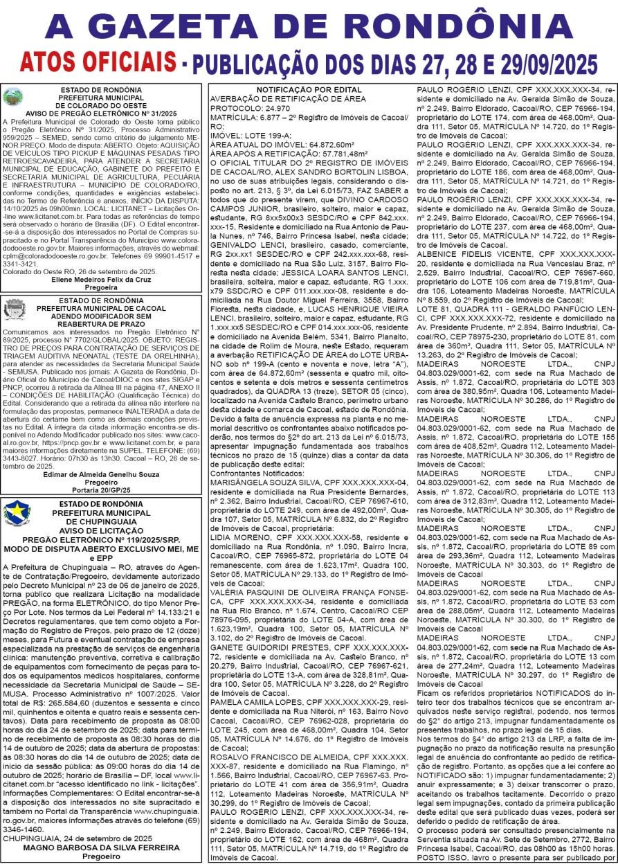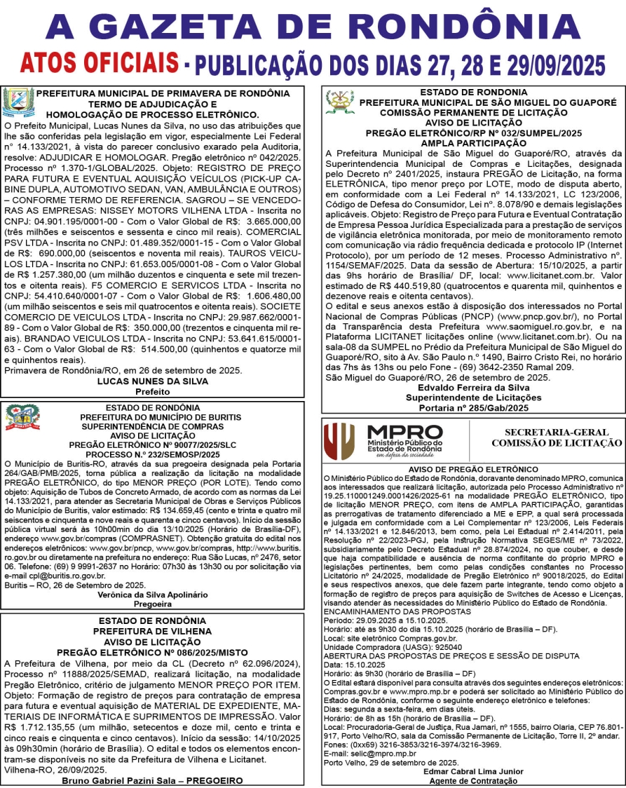 A GAZETA DE RONDÔNIA ATOS OFICIAIS PUBLICAÇÃO DOS DIAS 27, 28 E 29/09/2025