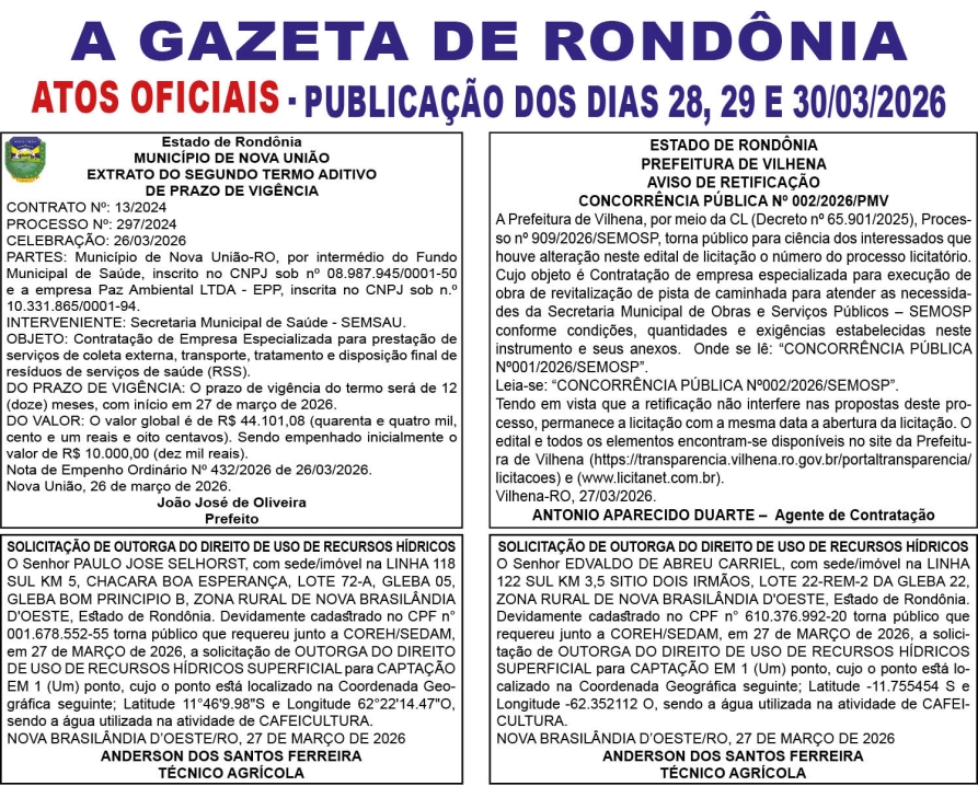 A GAZETA DE RONDÔNIA ATOS OFICIAIS PUBLICAÇÃO DOS DIAS 28, 29 E 30/03/2026