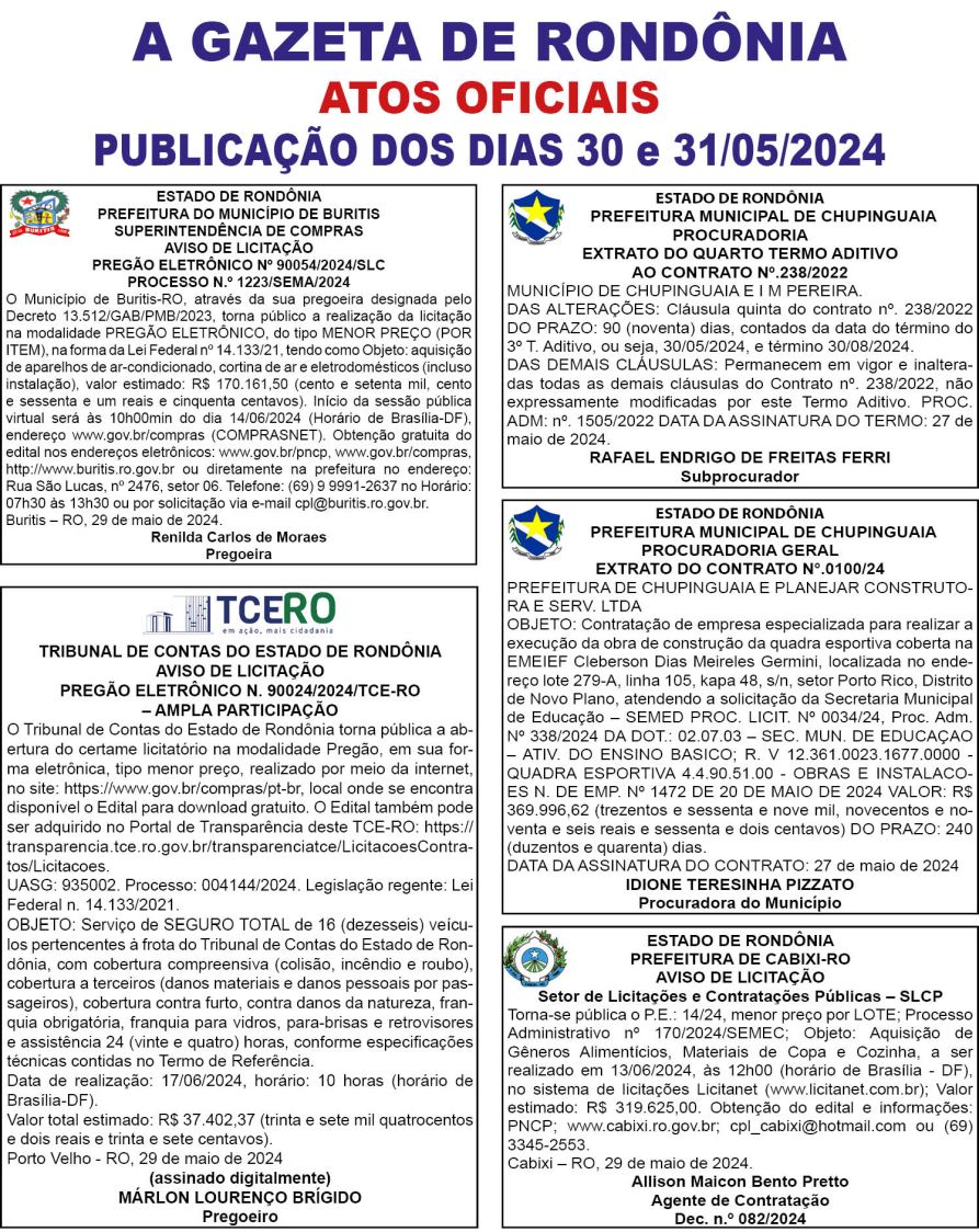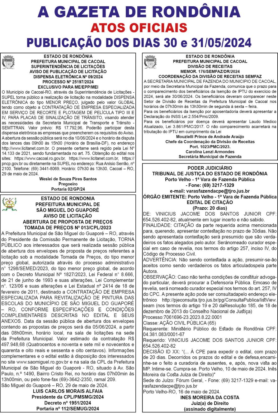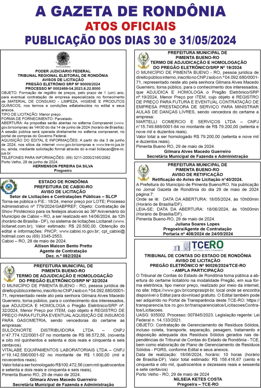 A GAZETA DE RONDÔNIA ATOS OFICIAIS PUBLICAÇÃO DOS DIAS 30 E 31/05/2024