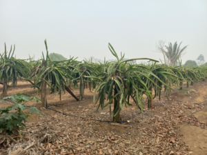 Mesmo sendo originária da América Central, a pitaia demonstrou excelente adaptação às condições climáticas de Rondônia. A planta, pertencente à família dos cactos, tolera bem períodos de estiagem, exige menor consumo de água e apresenta bom desempenho produtivo quando manejada com técnicas simples de tutoramento e poda.