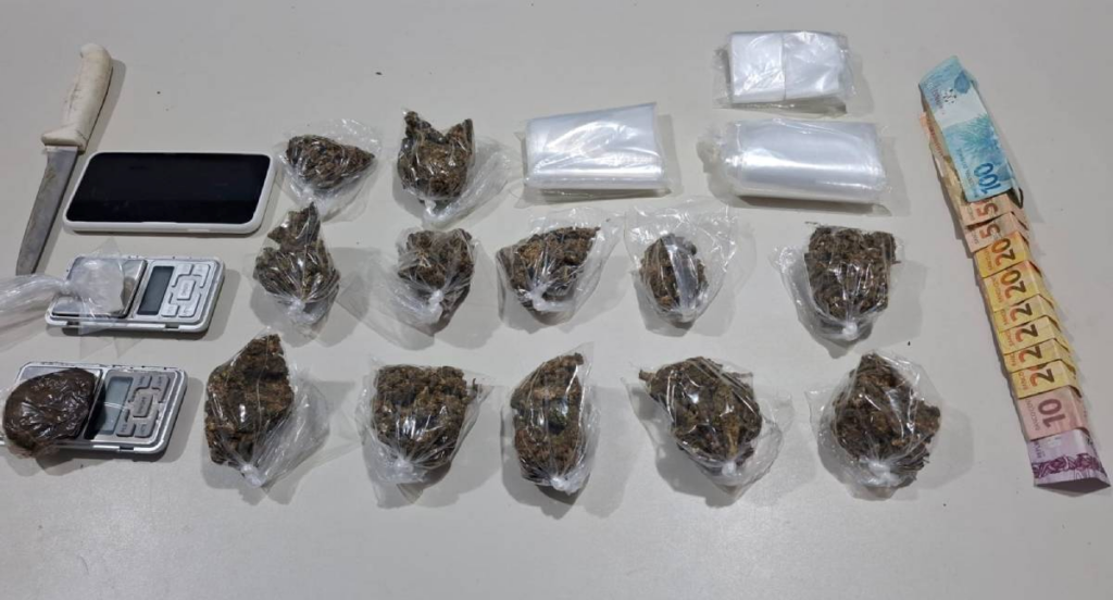 Também foram apreendidos R$ 335,00 em espécie e uma faca com resquícios de drogas, indicando a preparação do material para venda. A genitora relatou aos policiais que já estava ciente do comportamento problemático do filho e acompanhou toda a revista no imóvel.