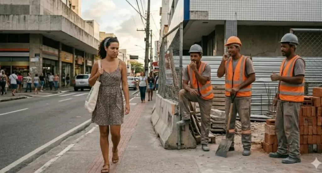 De acordo com o depoimento, os construtores dirigiam frases ofensivas e constrangedoras sempre que ela saía para a rua ou circulava em seu próprio quintal. Entre as expressões citadas na ocorrência estão comentários sobre sua aparência e propostas invasivas. Em um dos episódios mais graves, um dos homens chegou a declarar que assumiria o filho da vítima enquanto ela passeava com o bebê.