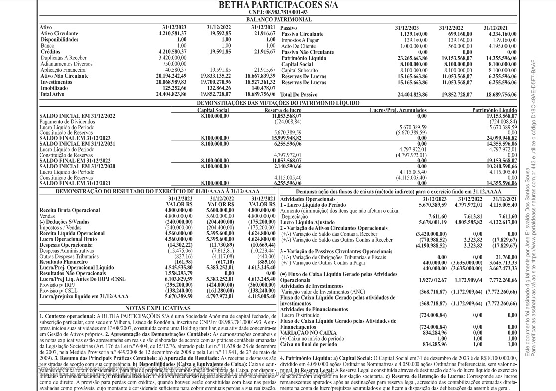 Balanço BETHA PARTICIPACÕES S/A